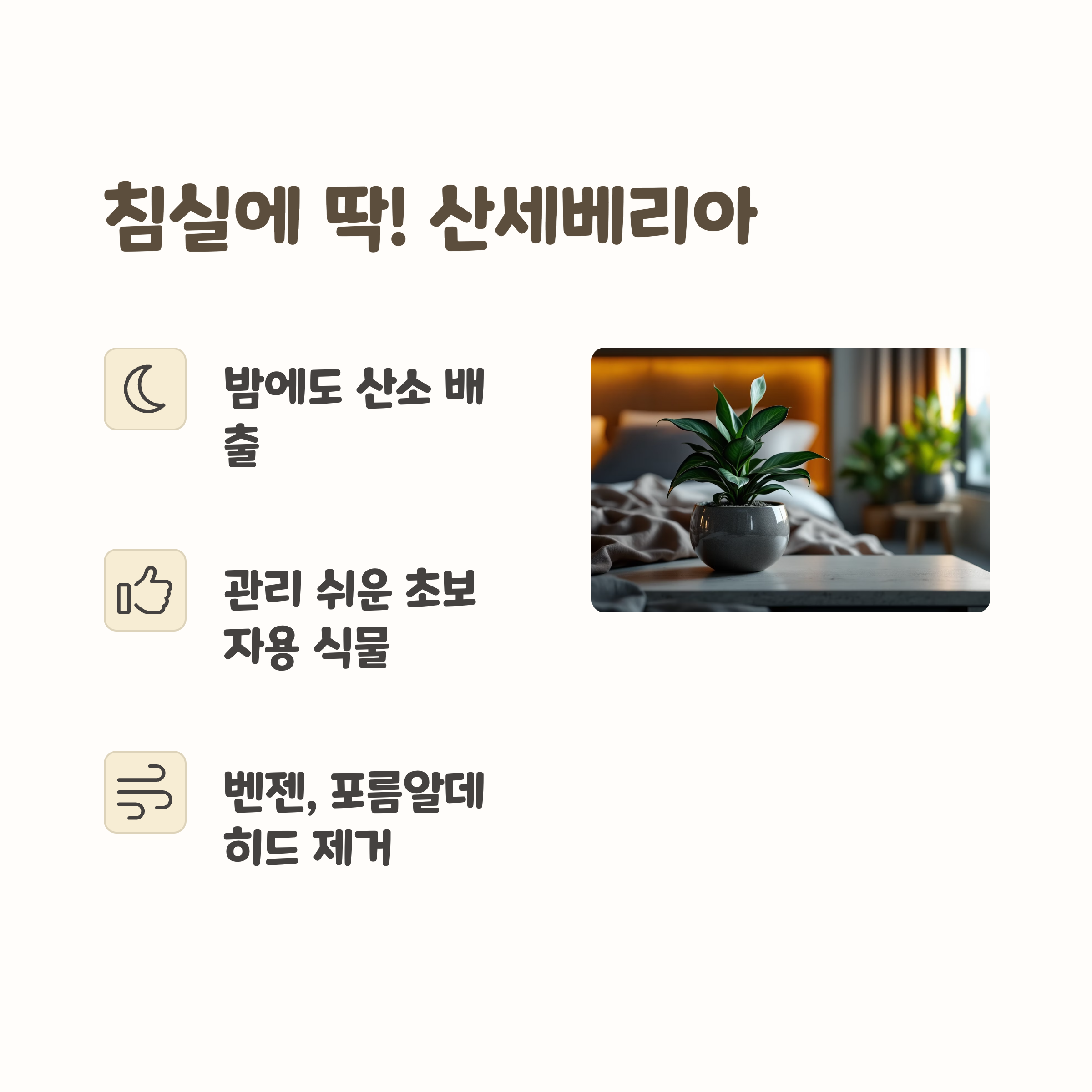 산세베리아는 거실, 침실, 심지어 햇빛이 적은 화장실에도 놓을 수 있어 활용도가 매우 높습니다. 다양한 크기와 무늬가 있어 인테리어 스타일에 맞게 선택할 수 있다는 것도 실내 공기정화 식물 중에서도 산세베리아만의 장점이에요. 🪴