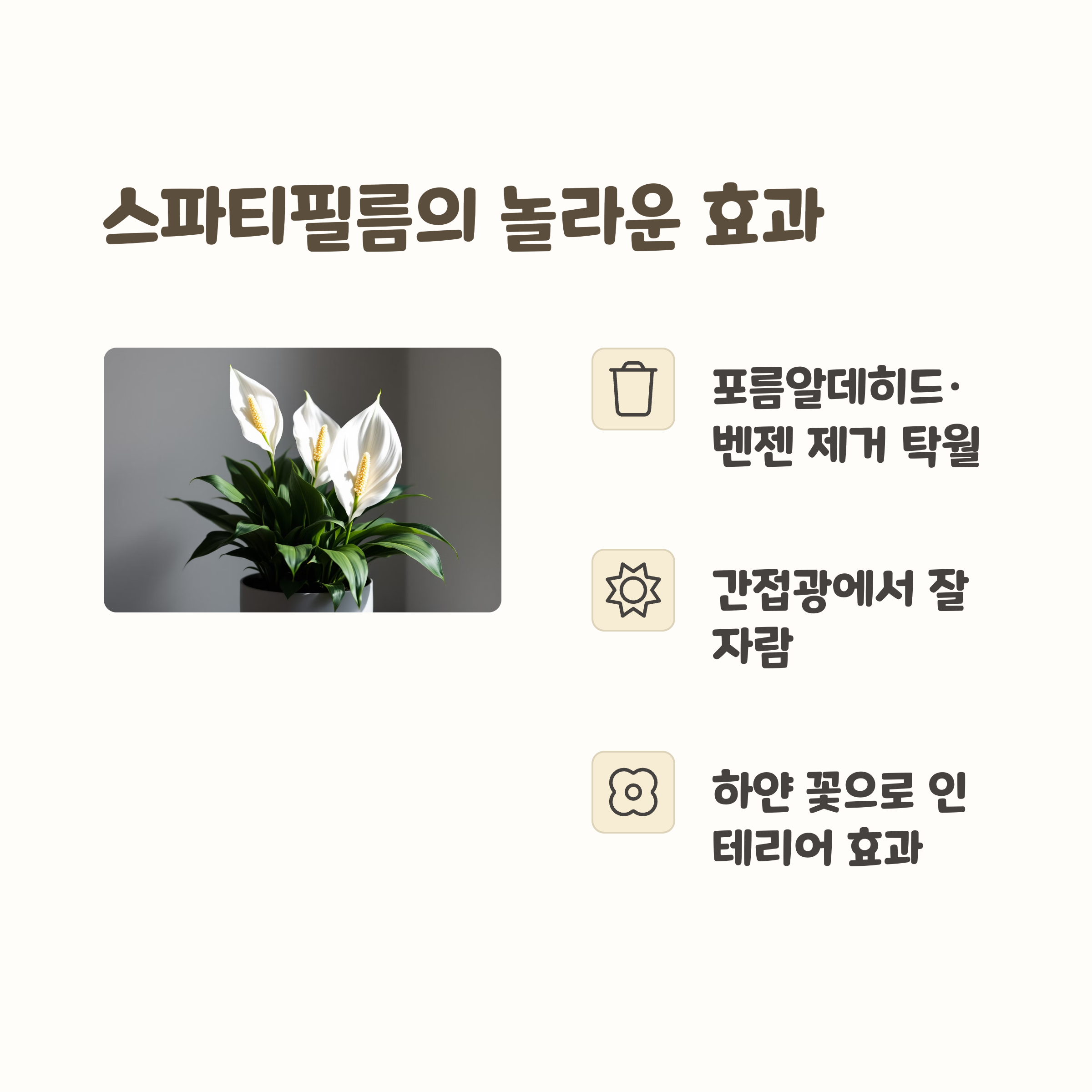 | 스파티필름 | 1주에 1회 | 간접광 | 쉬움 | 포름알데히드, 벤젠, 트리클로로에틸렌 |