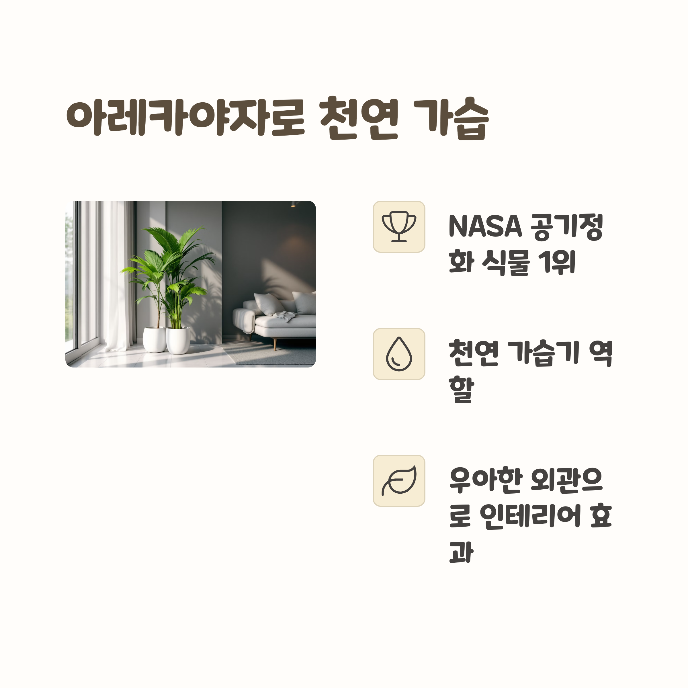 특히 겨울철 난방으로 건조해지는 실내에서 아레카야자는 공기 중 수분을 공급해 쾌적한 습도를 유지하는 데 도움을 줍니다.