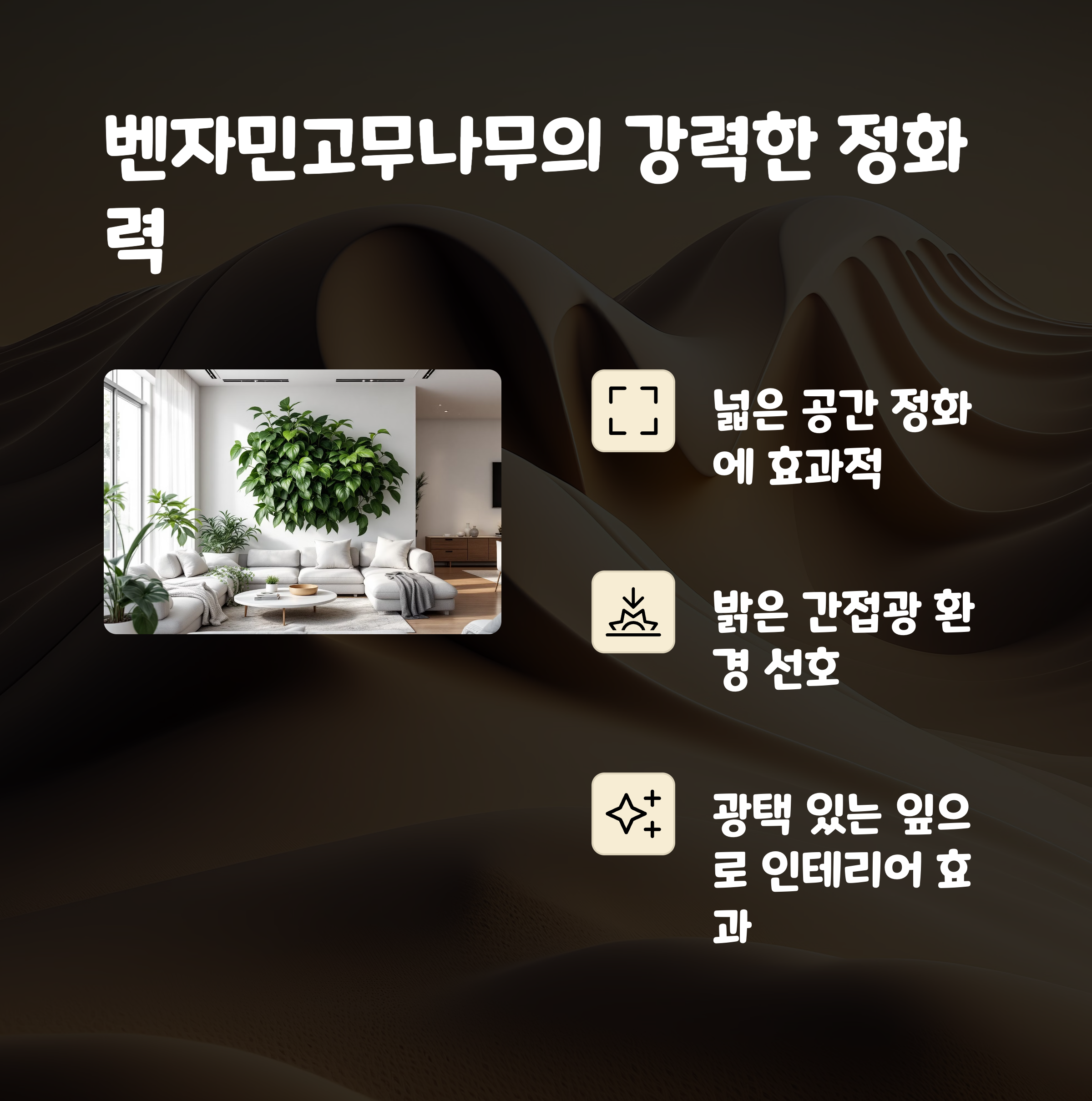 | 벤자민고무나무 | 흙 표면 건조 시 | 밝은 간접광 | 보통 | 포름알데히드, 자일렌, 톨루엔 |