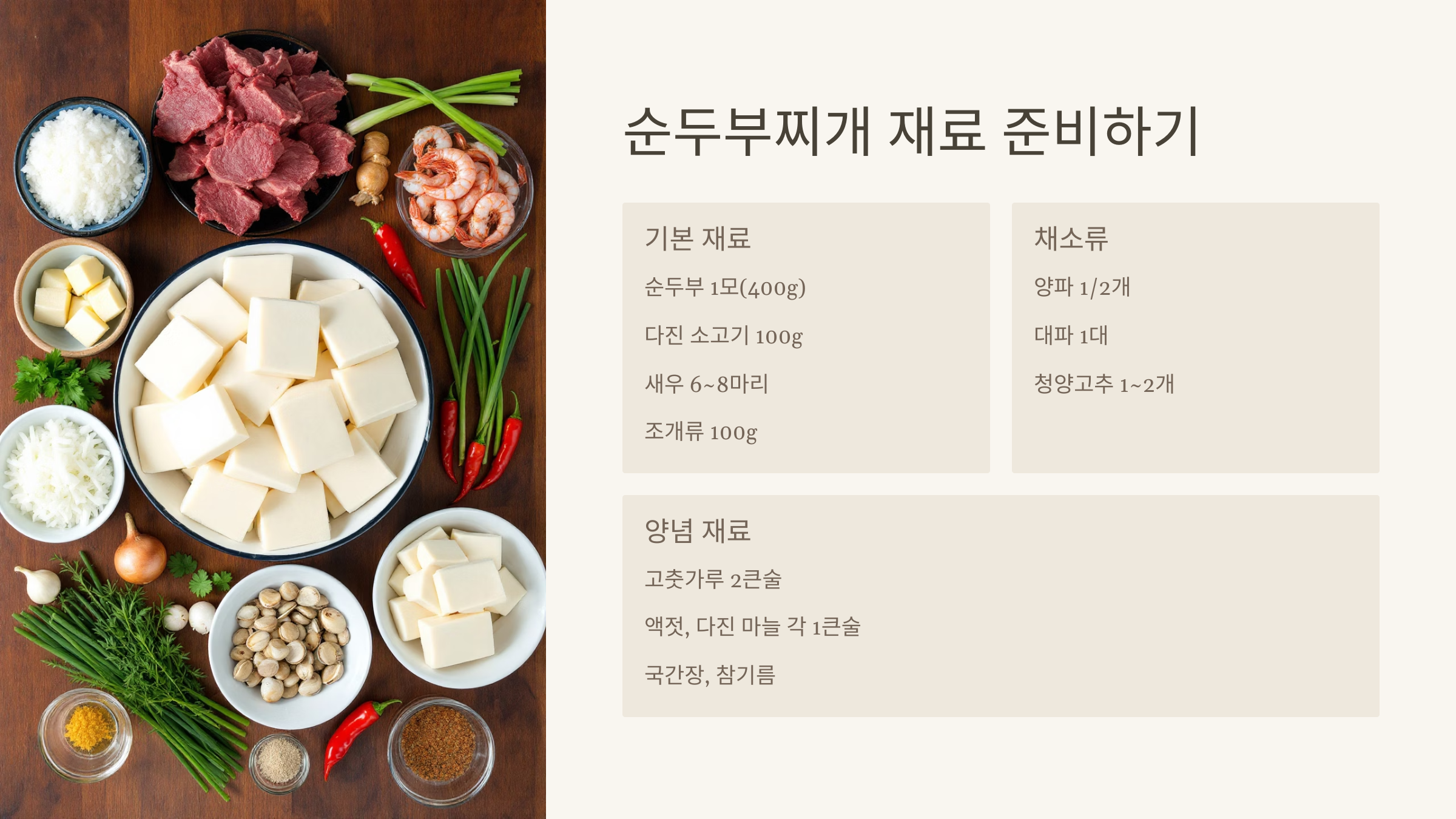 맛있는 순두부찌개를 만들기 위해서는 신선한 재료 준비가 가장 중요합니다. 아래 재료들을 준비해주세요.