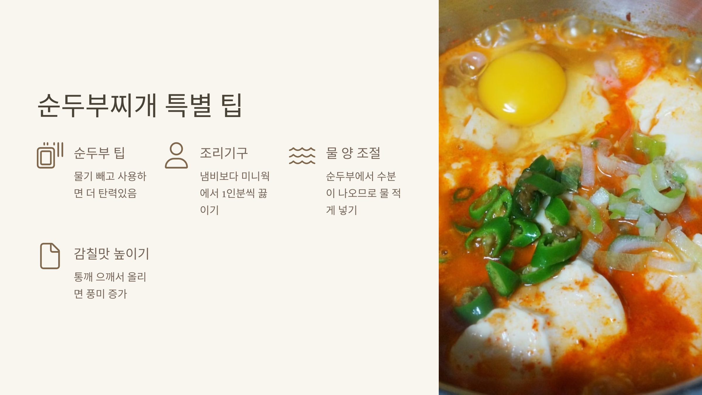 이런 작은 비법들이 순두부찌개 황금레시피의 맛을 결정짓는 중요한 요소입니다. 취향에 맞게 활용해보세요!