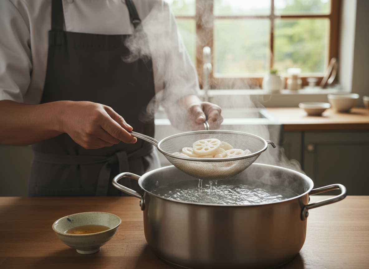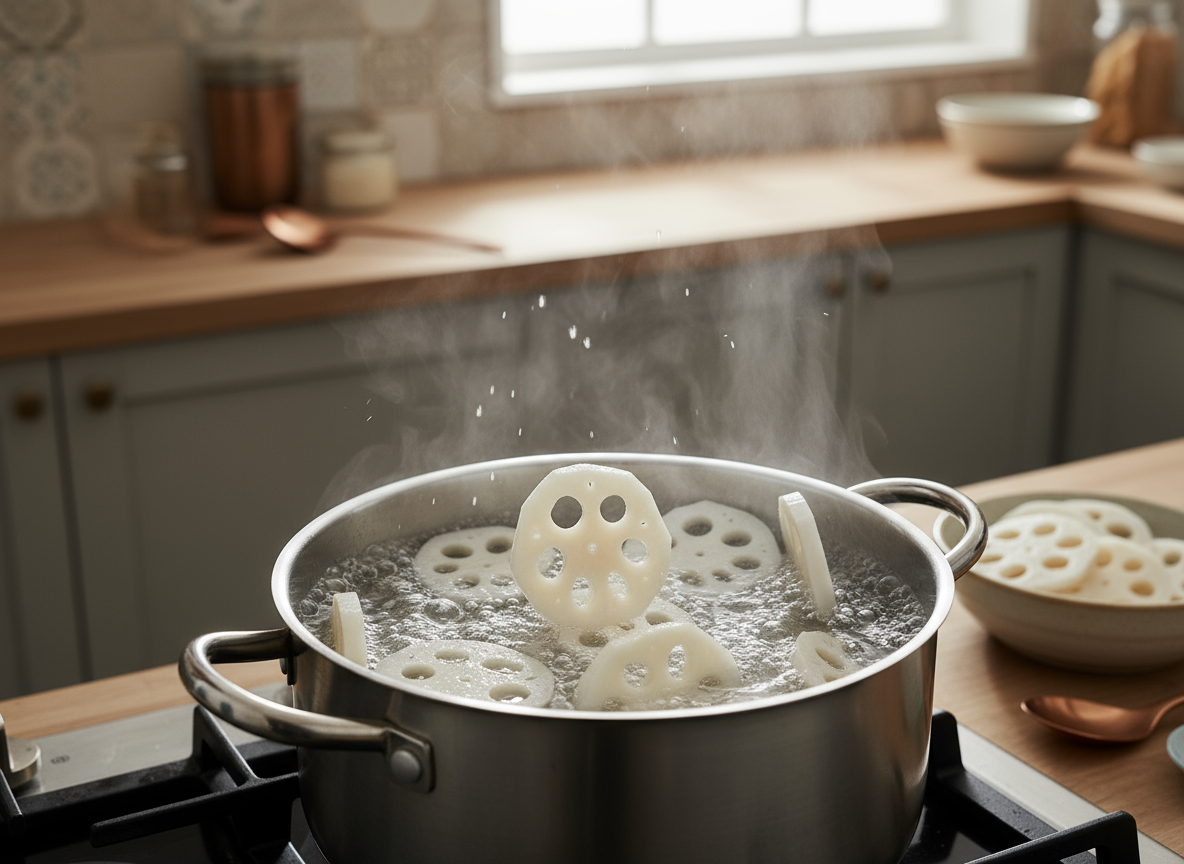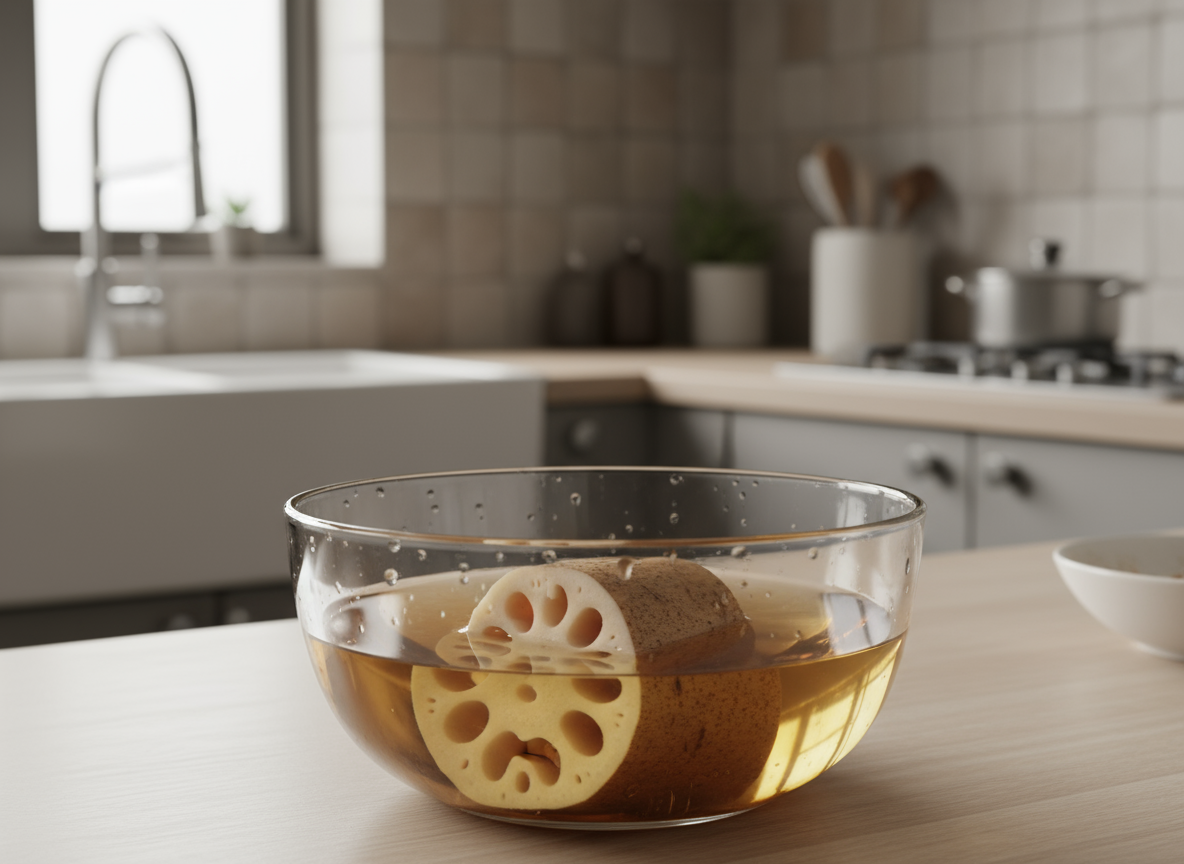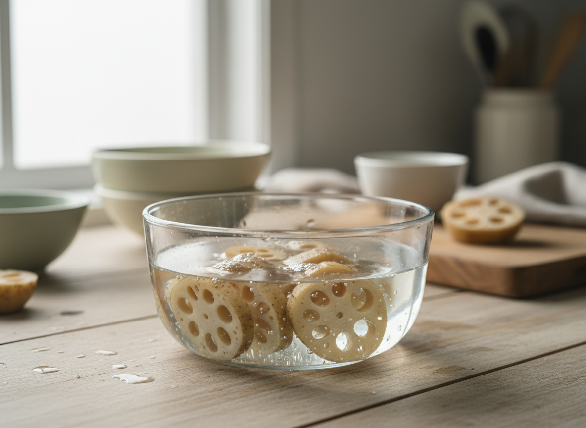식초물 활용: 연근을 자르는 즉시 식초물에 담가두면 갈변을 방지할 수 있어요. 쇠칼이나 쇠 냄비를 사용하면 갈변이 더 심해질 수 있으니 주의하세요.