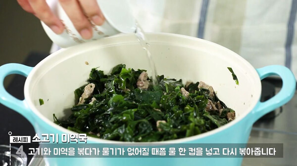 이때 진한 국물을 만드는 비법 한 가지! 고기와 미역을 볶다가 물기가 없어질 때쯤 물 한 컵을 넣고 다시 계속 볶는다.