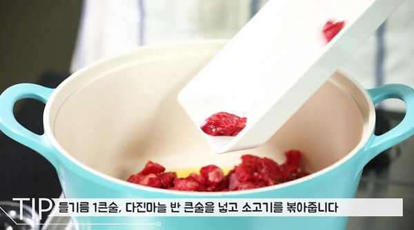 소고기의 핏물을 제거했으면 냄비에 들기름 1큰 술과 다진 마늘 반 큰술, 핏물을 제거한 소고기를 넣고 함께 볶아준다.