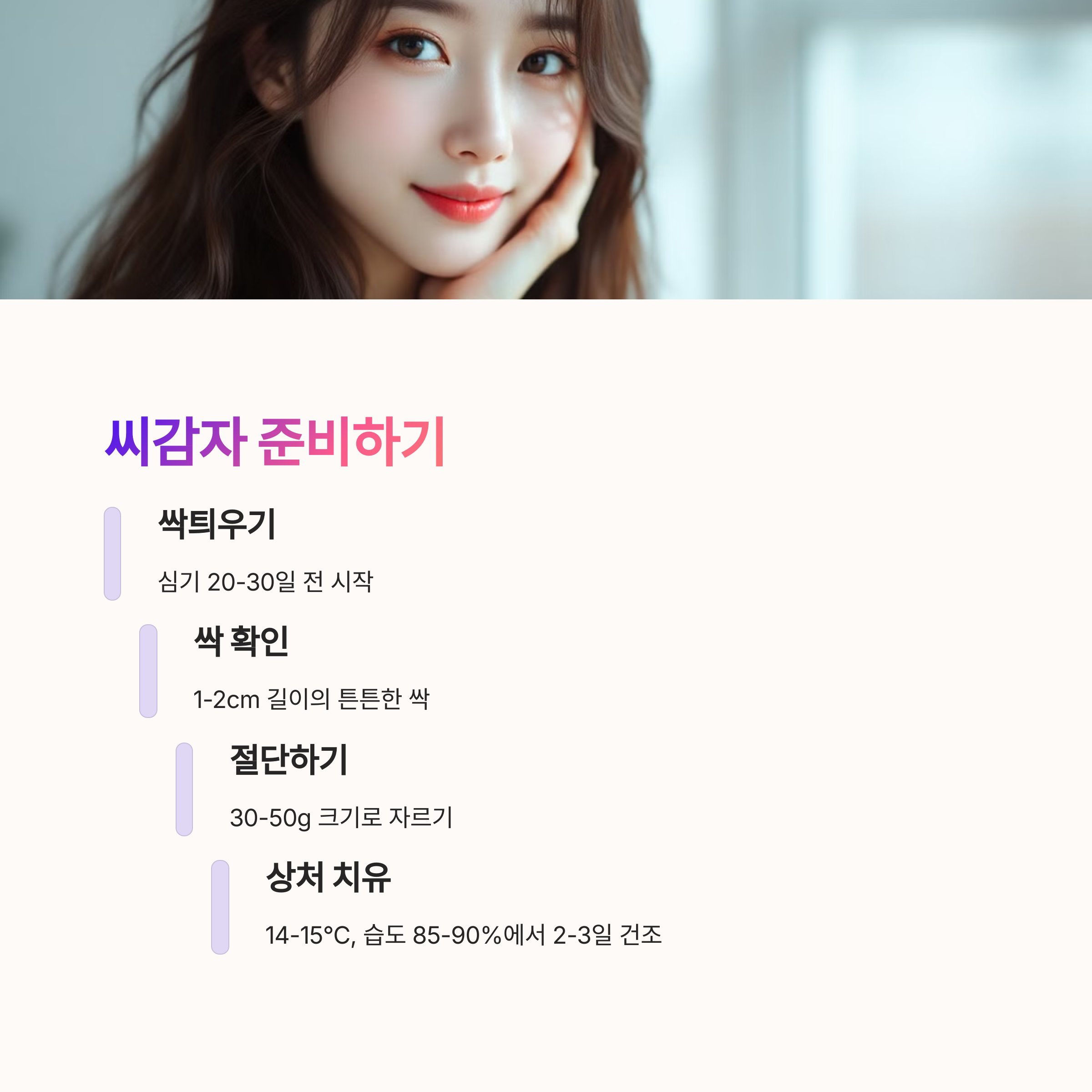 절단면을 그늘에서 1~2일 말려 부패를 방지하고, 싹이 1cm 정도 난 것이 발아에 유리해요.