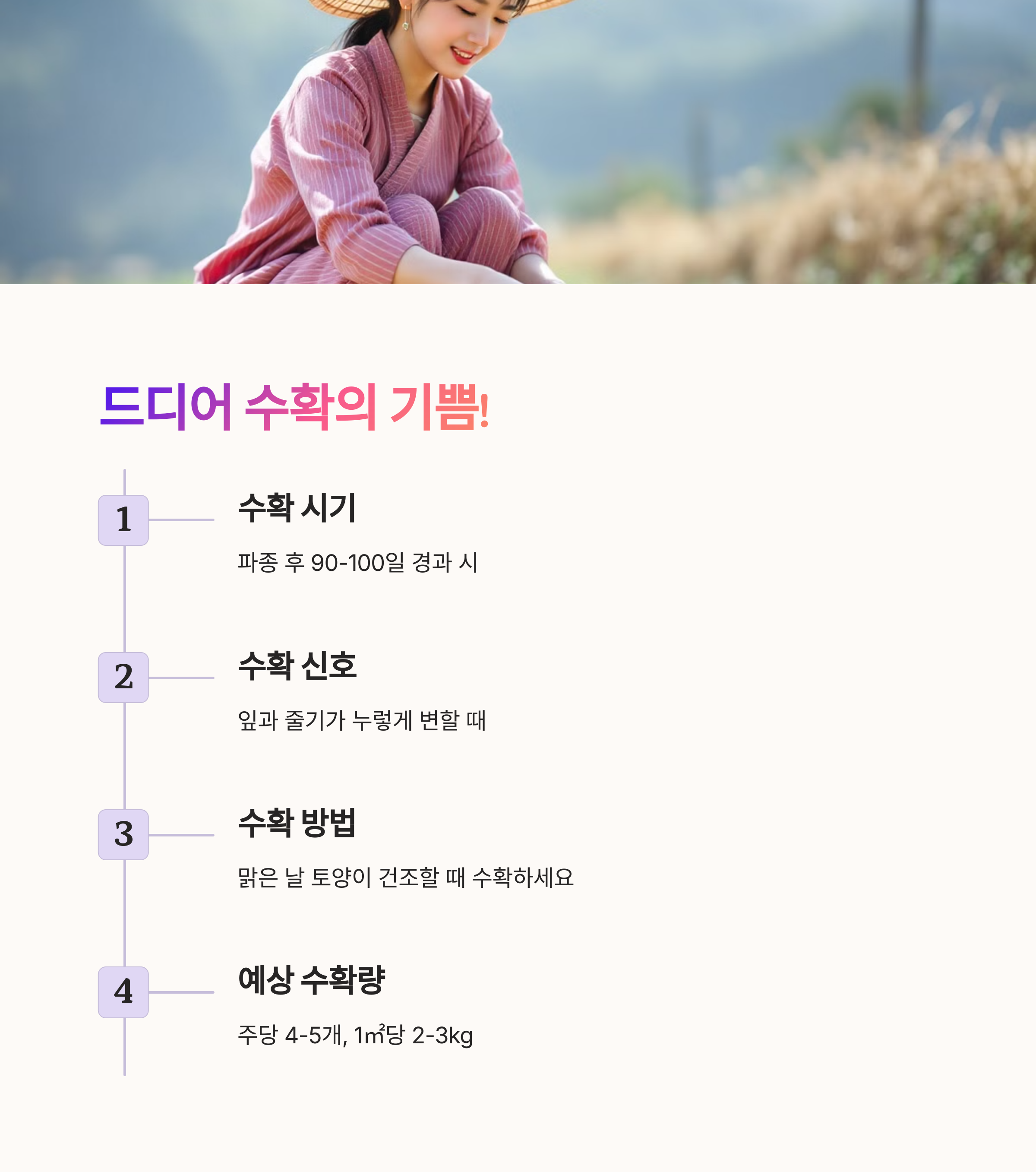 수확 시기: 심은 지 90~120일 후, 잎과 줄기가 노랗게 시들면 적기예요.