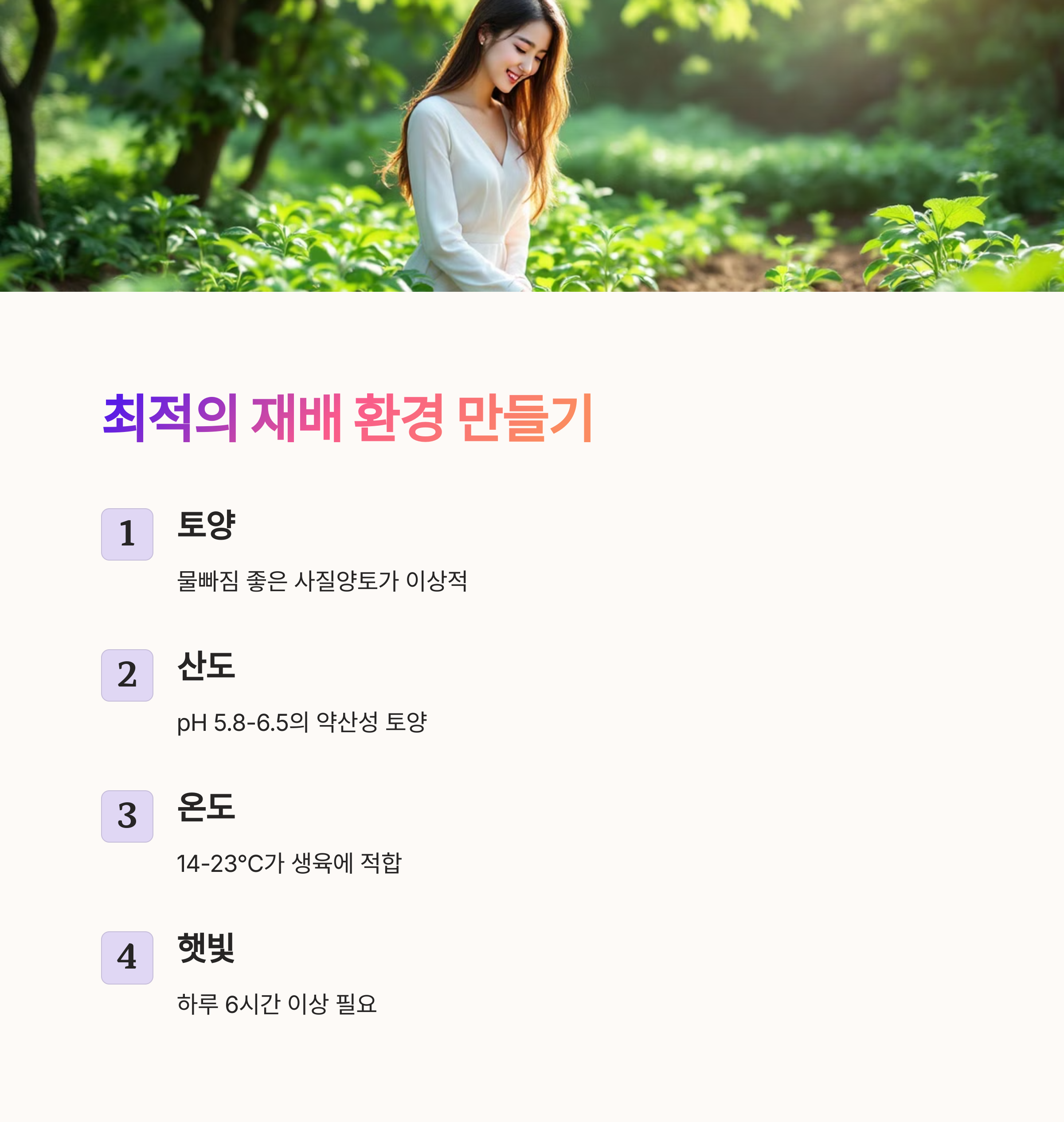 토양: 물빠짐이 좋은 사질양토(모래+양토)가 이상적. pH 5.5~6.5의 약산성 토양에서 잘 자라며,