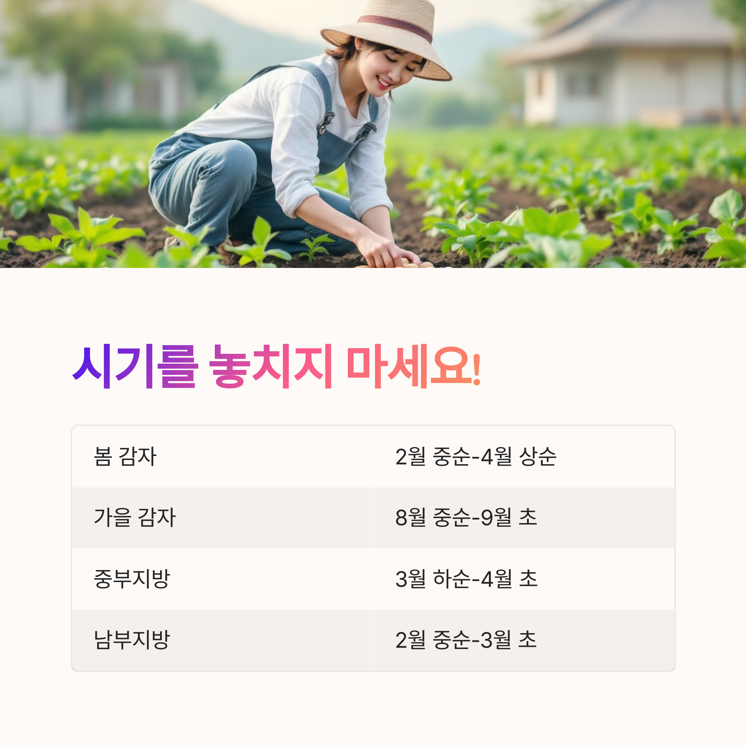 남부지방 감자 심는 시기(경남, 전남, 제주 등): 2월 말~3월 중순 (토양 온도 10°C 이상)