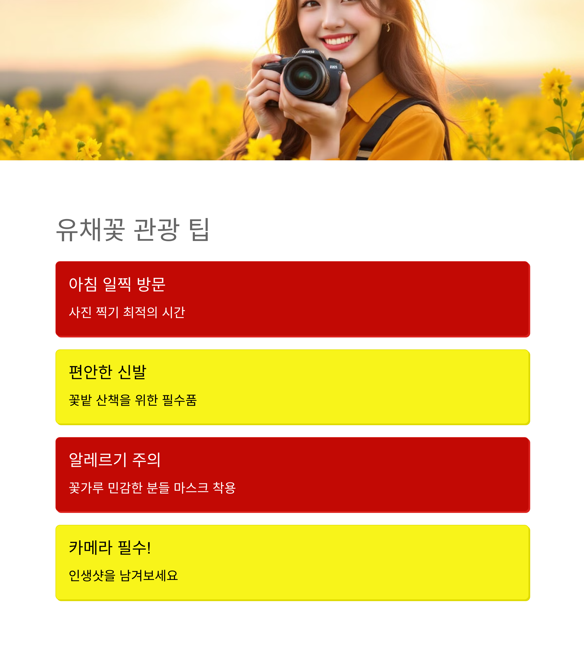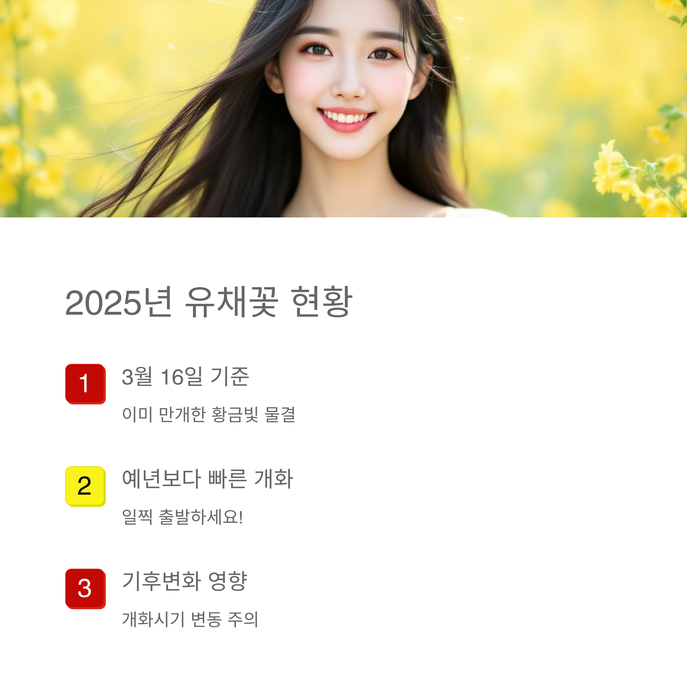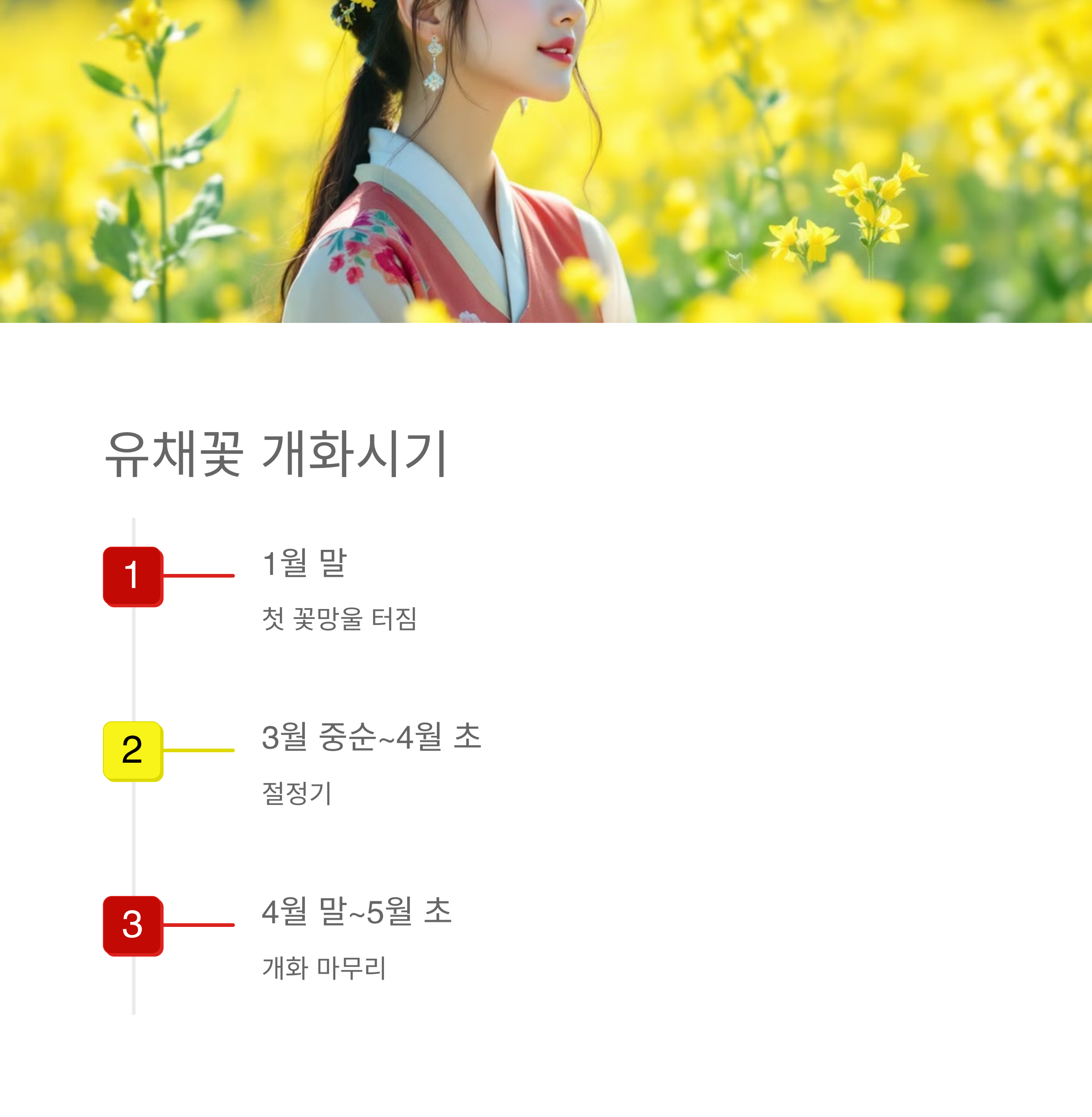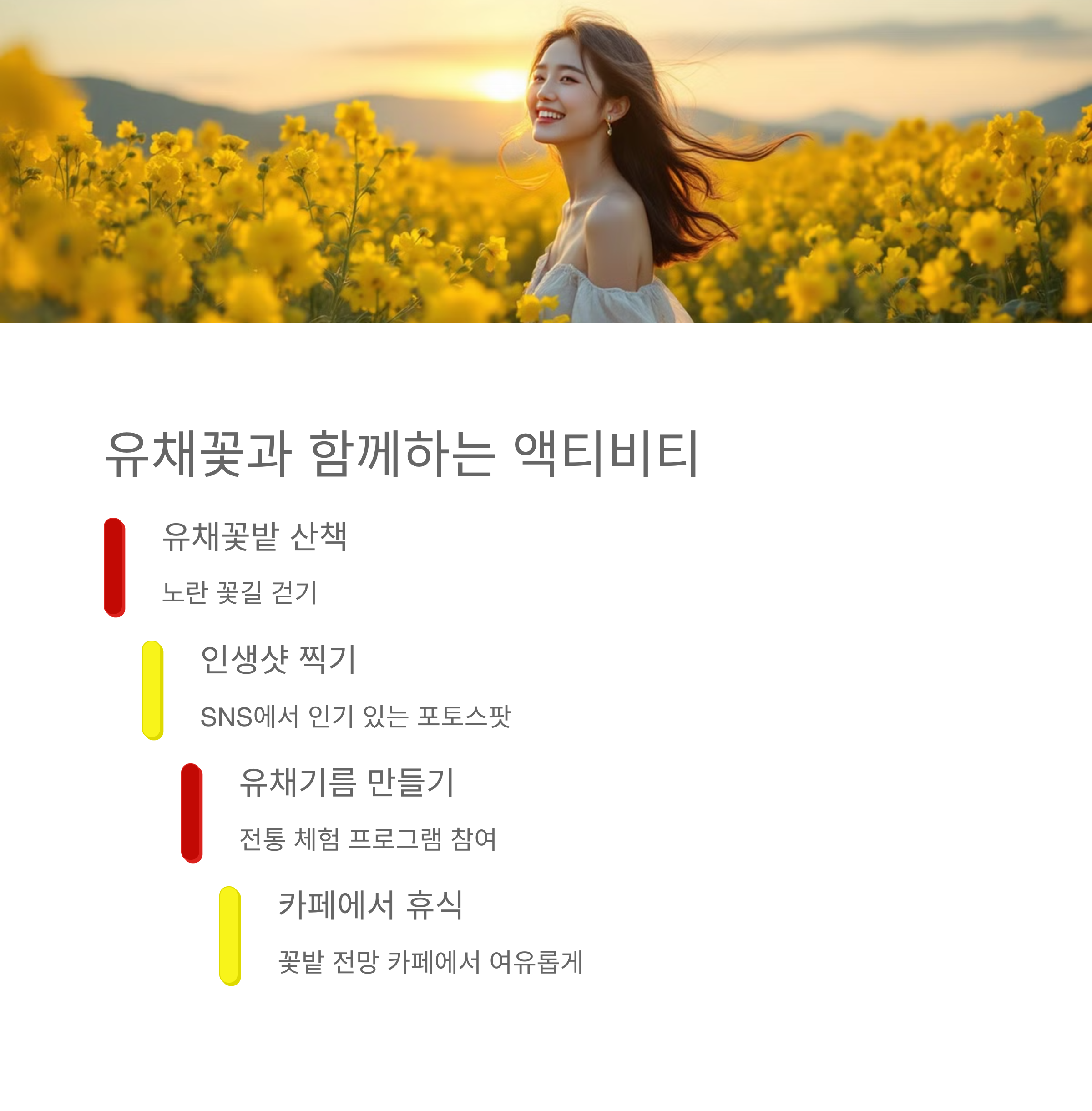 옷차림: 3월엔 바람이 쌀쌀할 수 있으니 얇은 재킷 챙기고, 노란 유채꽃과 대비되는 파스텔톤 옷 입으면 사진 잘 나와요.