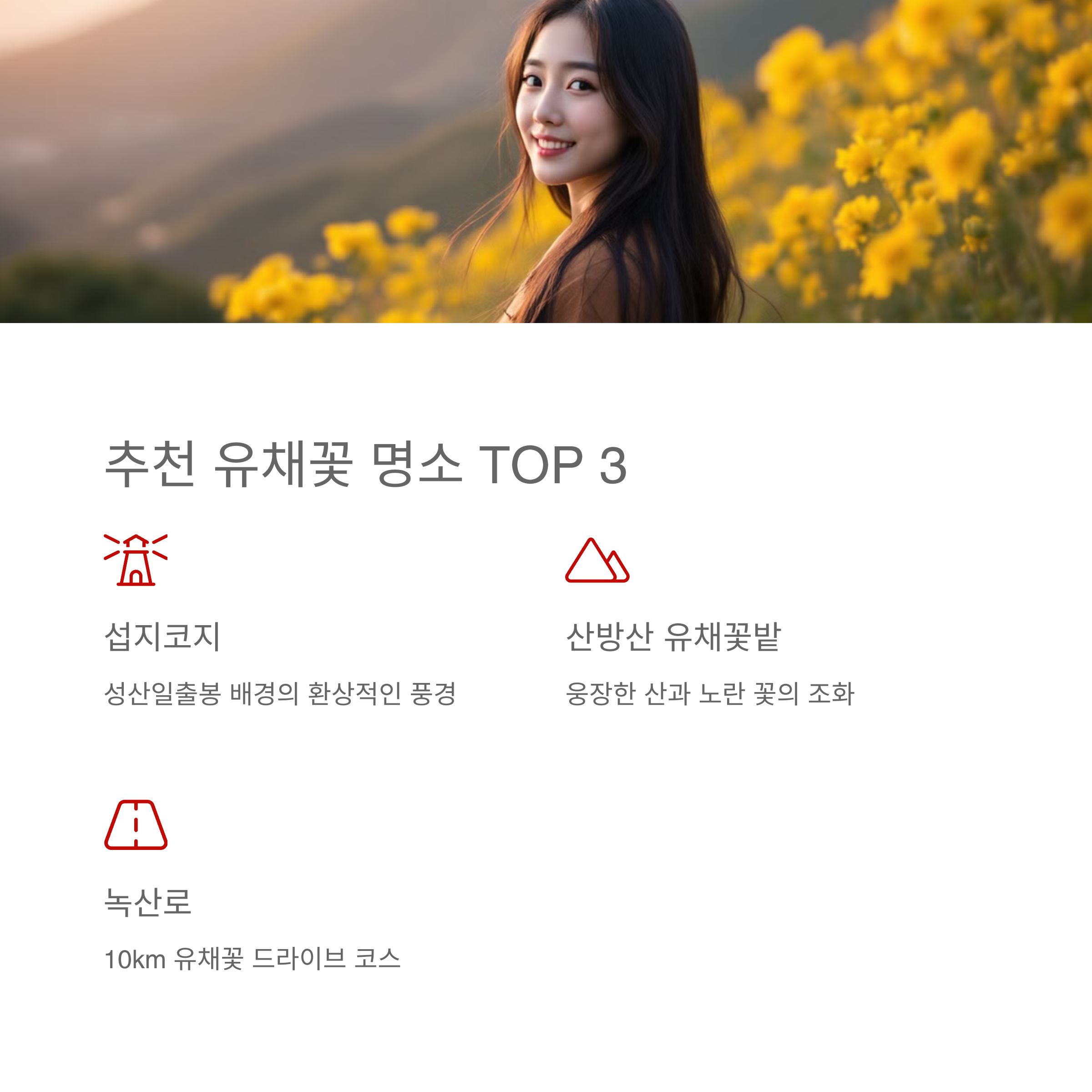 최적 촬영 시간: 아침 9시11시, 오후 4시6시 사이 햇빛이 부드러워 사진이 예쁘게 나와요. 저는 섭지코지에서 아침 햇살 받는 유채꽃 찍었는데 인생샷 건졌어요!