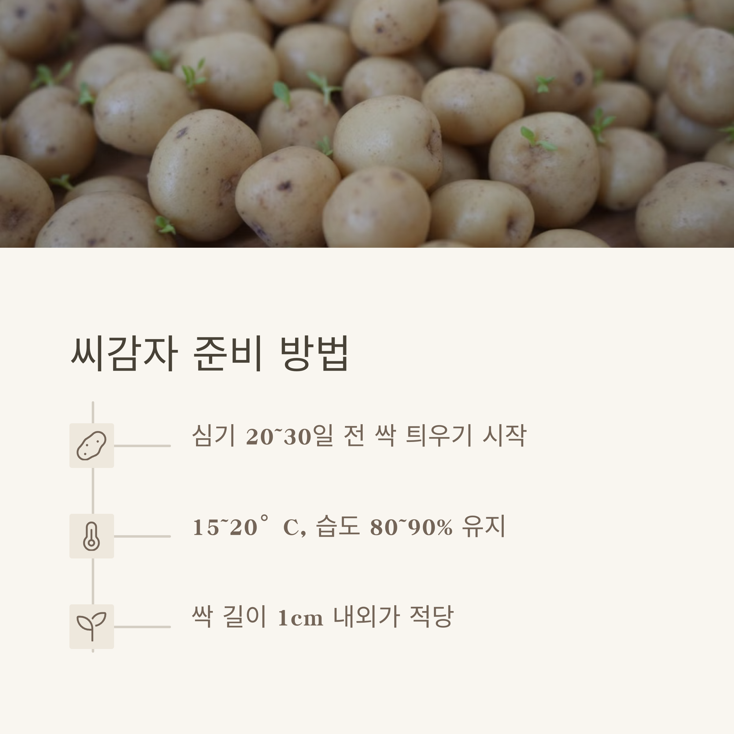 크기가 30~60g 정도 되는 건강한 통감자를 선택하세요. 농협이나 종묘상에서 싹이 조금 난 씨감자를 사는 게 편해요. 저는 ‘수미’ 품종을 주로 심는데, 재배 기간이 90~100일로 무난하고 맛도 좋아요. 가을엔 ‘새봉’ 품종도 추천합니다!