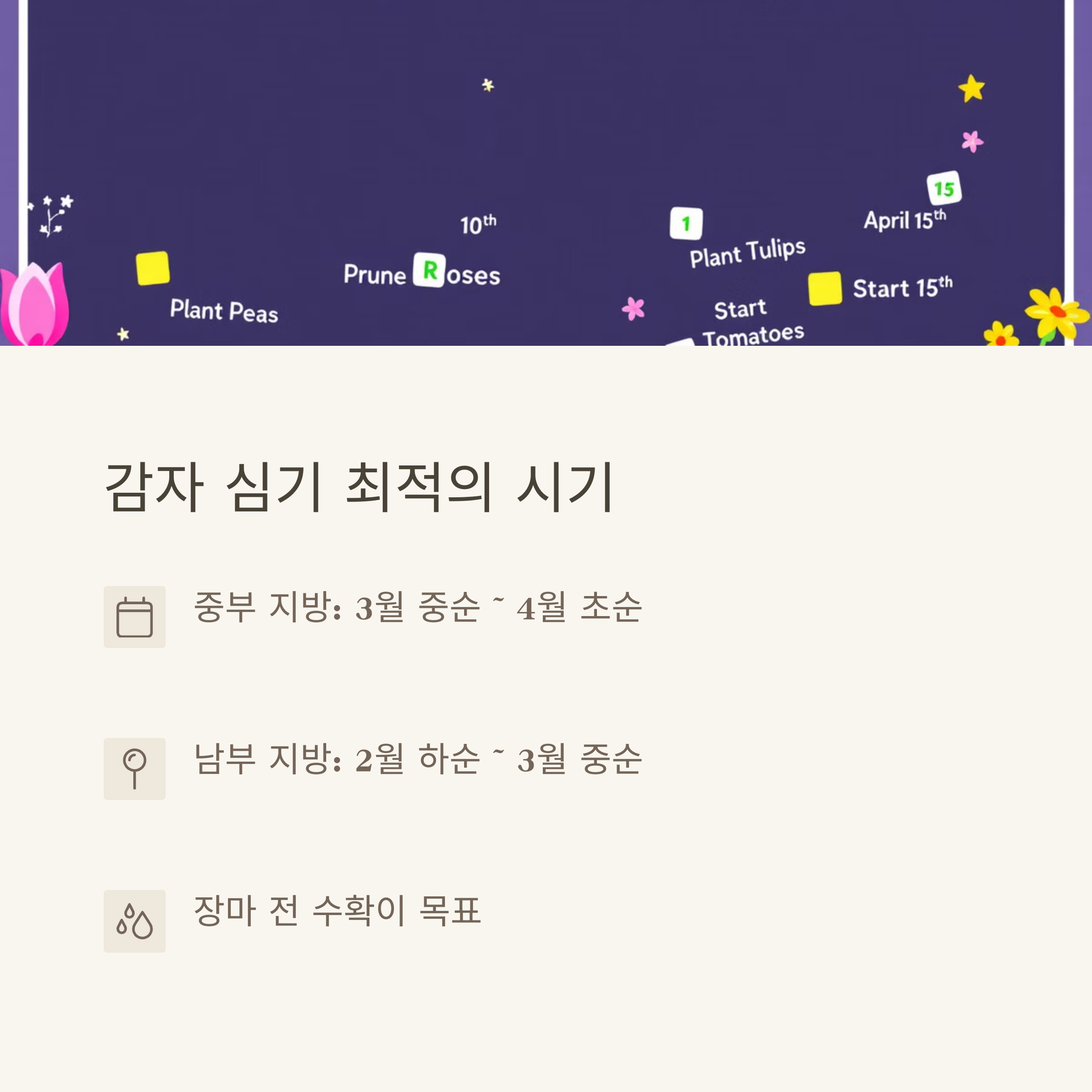 왜 이 시기?: 봄 감자는 장마(6월 말7월 초) 전에 수확하려면 생육 기간(약 90~100일)을 고려해야 해요.