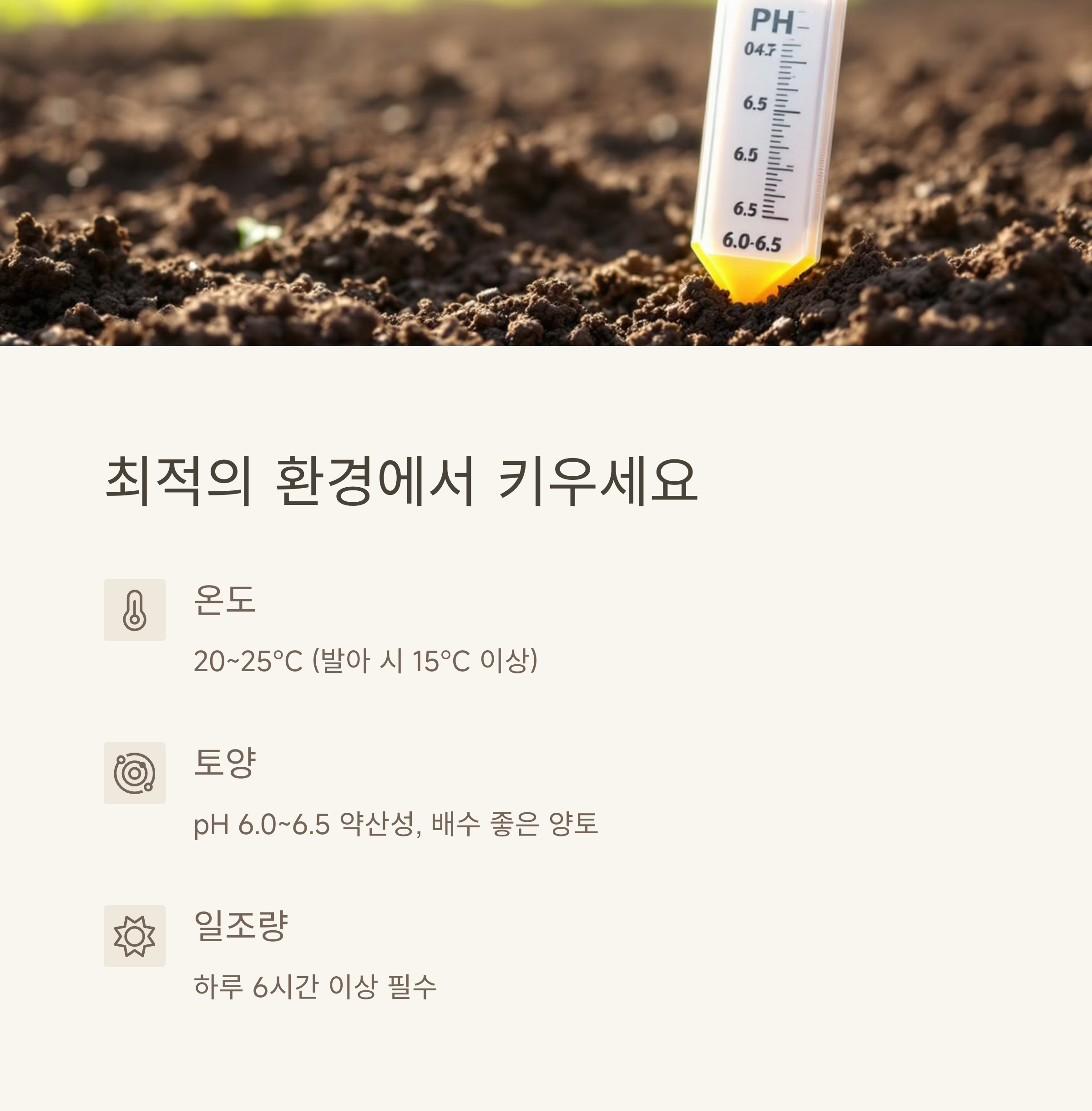 토양은 pH 6.0~7.0의 약산성 또는 중성이 적합하며, 모래와 점토가 적절히 섞인 사질양토가 이상적이에요.
