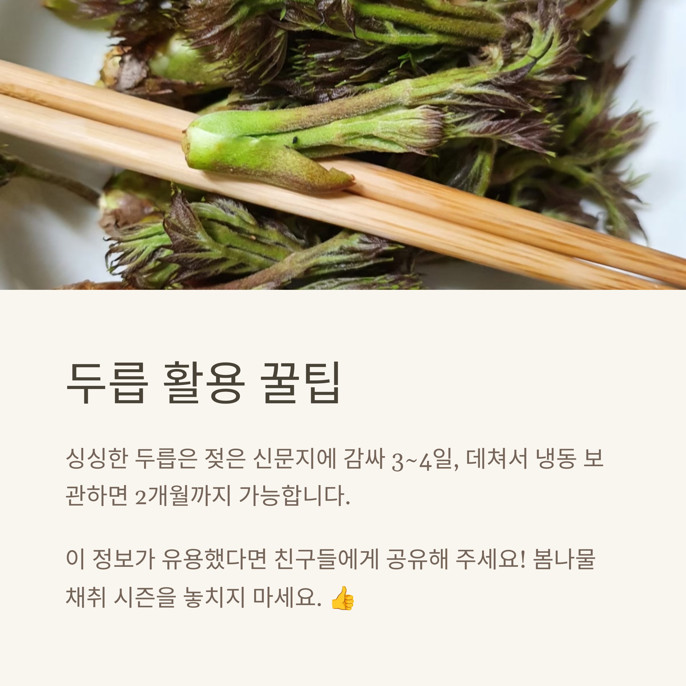 보관법까지 챙기면 언제든 두릅의 향을 느낄 수 있답니다. 이번 봄, 두릅과 함께 건강한 식탁을 꾸며보세요! 🌿