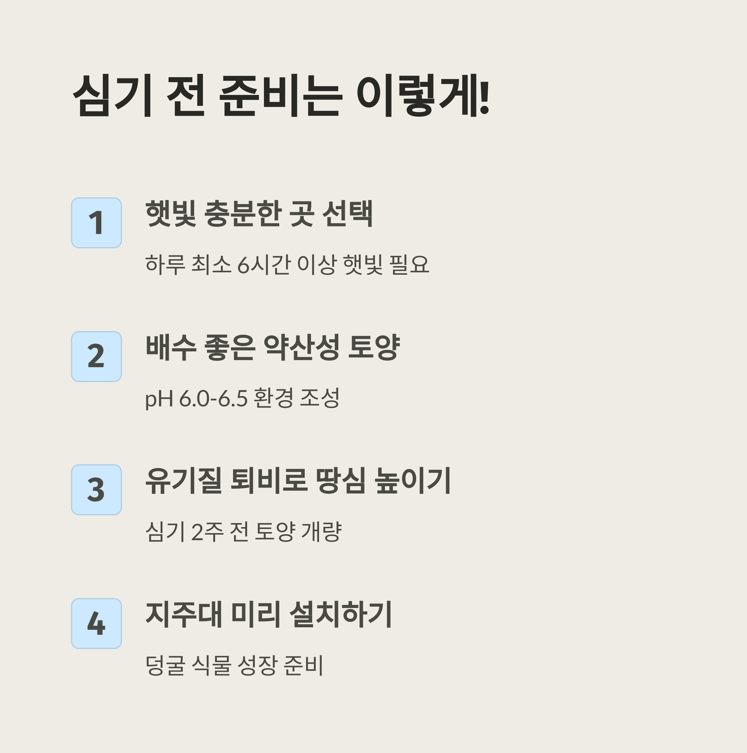 토양은 물 빠짐이 좋으면서도 보습력이 있는 유기질 토양이 좋아요. 햇빛도 충분히 받아야 하니, 하루 6시간 이상 햇볕이 드는 장소를 골라주세요!