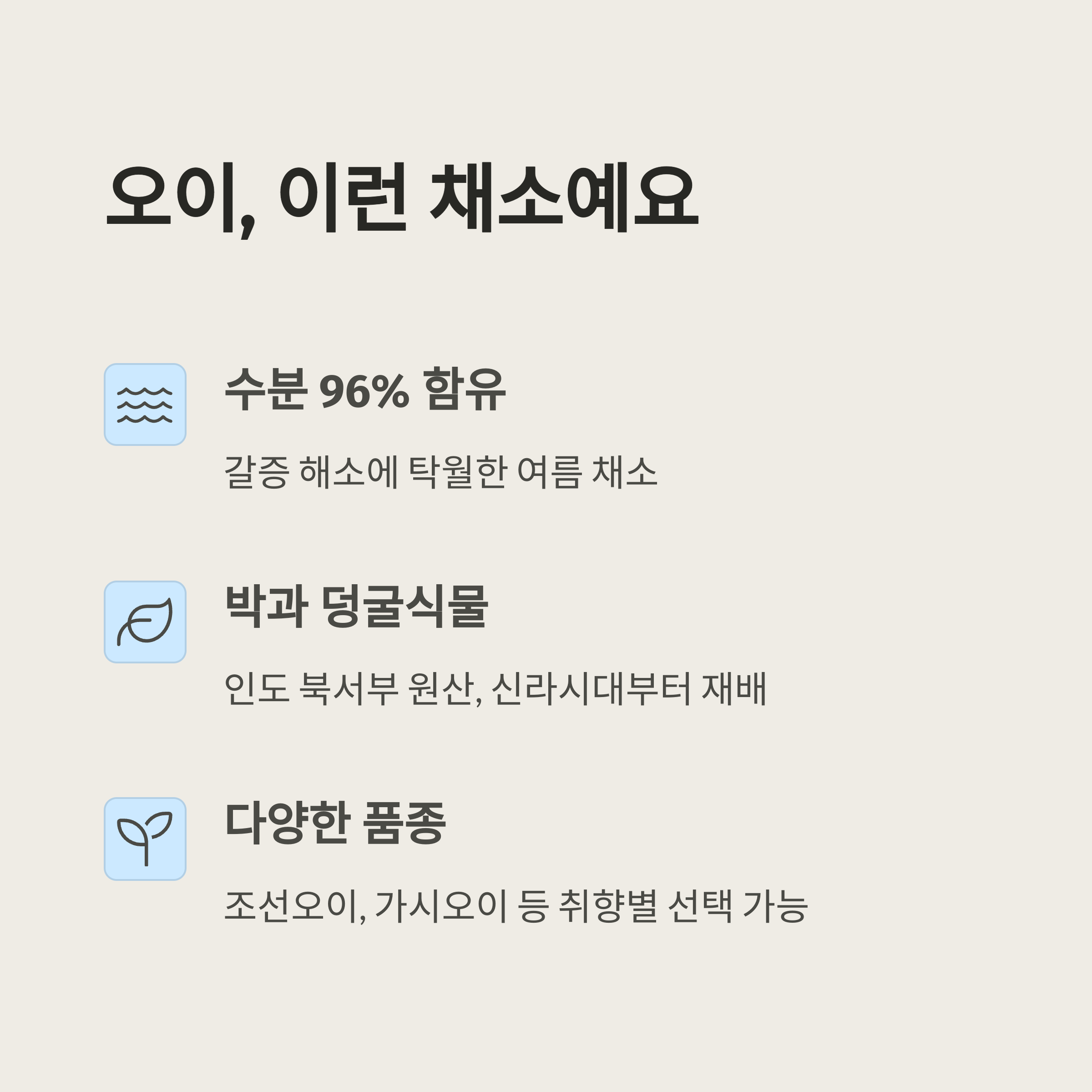 오이는 박과에 속하는 1년생 덩굴성 작물로, 원산지는 인도 북서부예요. 수분이 96% 이상을 차지해 갈증 해소에 탁월하고, 칼륨이 풍부해 노폐물 배출에도 도움을 준답니다.