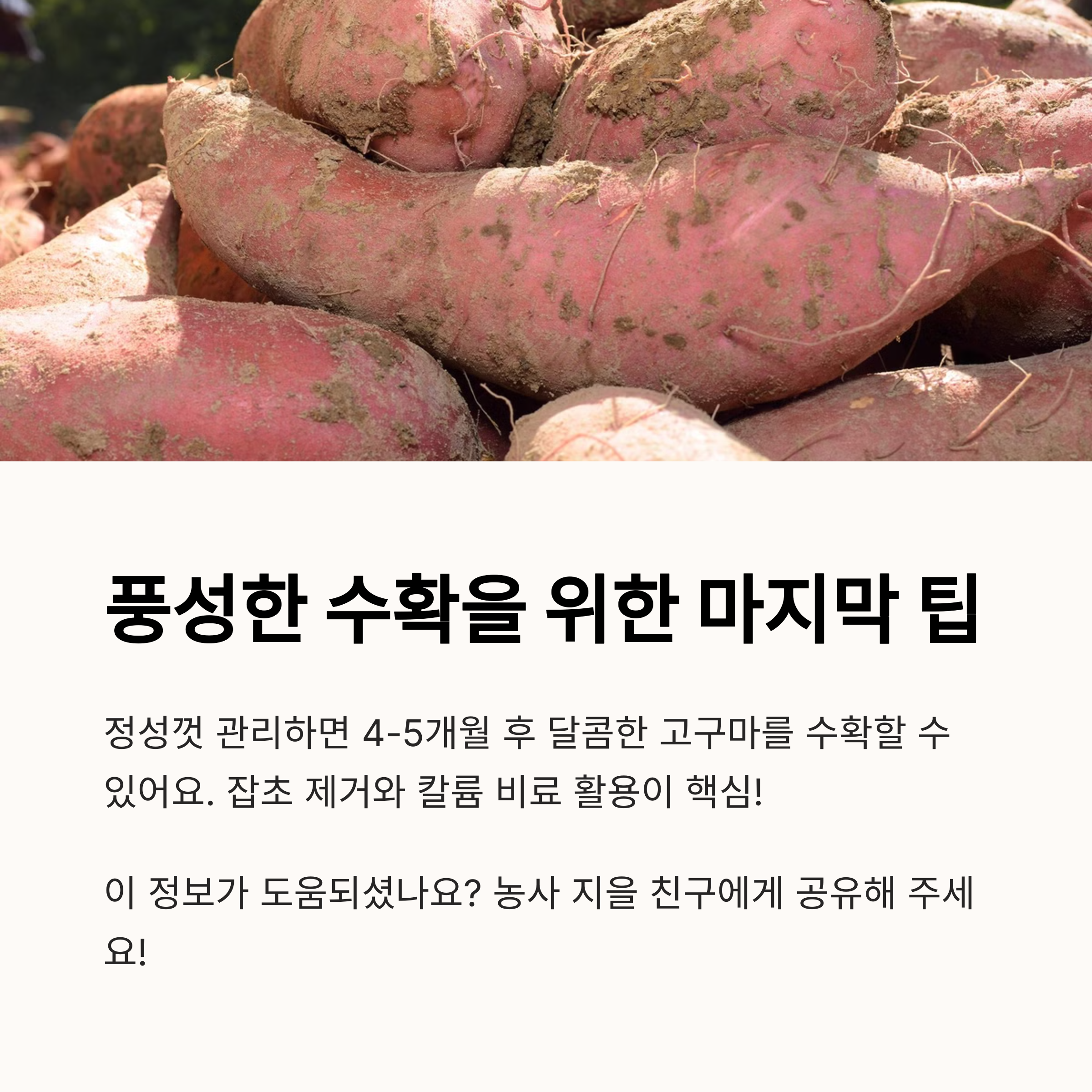 농촌진흥청(http://www.rda.go.kr)에서 더 많은 정보를 얻을 수도 있으니 참고하세요. 여러분의 텃밭에 달콤한 고구마가 가득하길 바랄게요! 😊