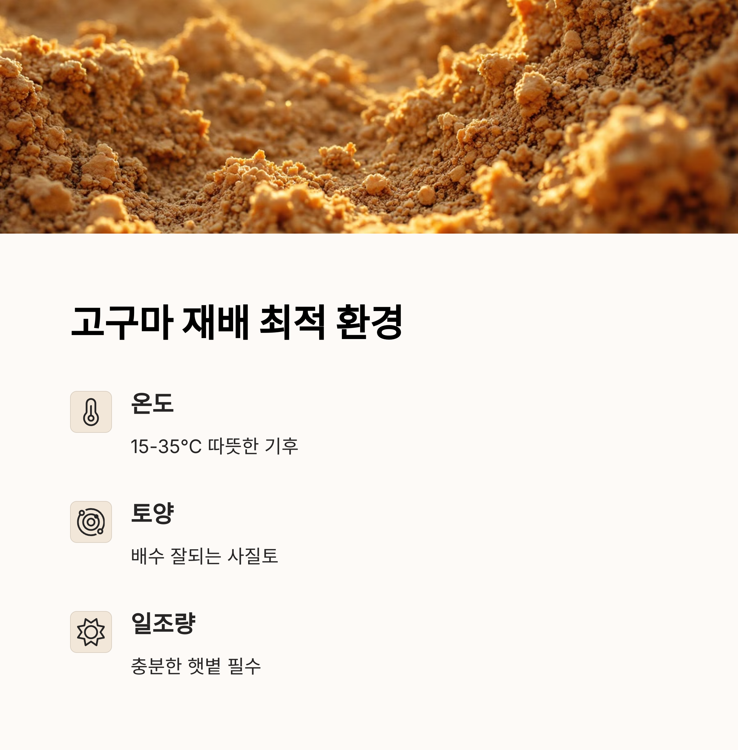 고구마는 따뜻한 기후와 햇볕을 좋아하는 작물이에요. 생육 적정 온도는 15~35℃로, 특히 지온이 15℃ 이상일 때 뿌리가 잘 자랍니다.
