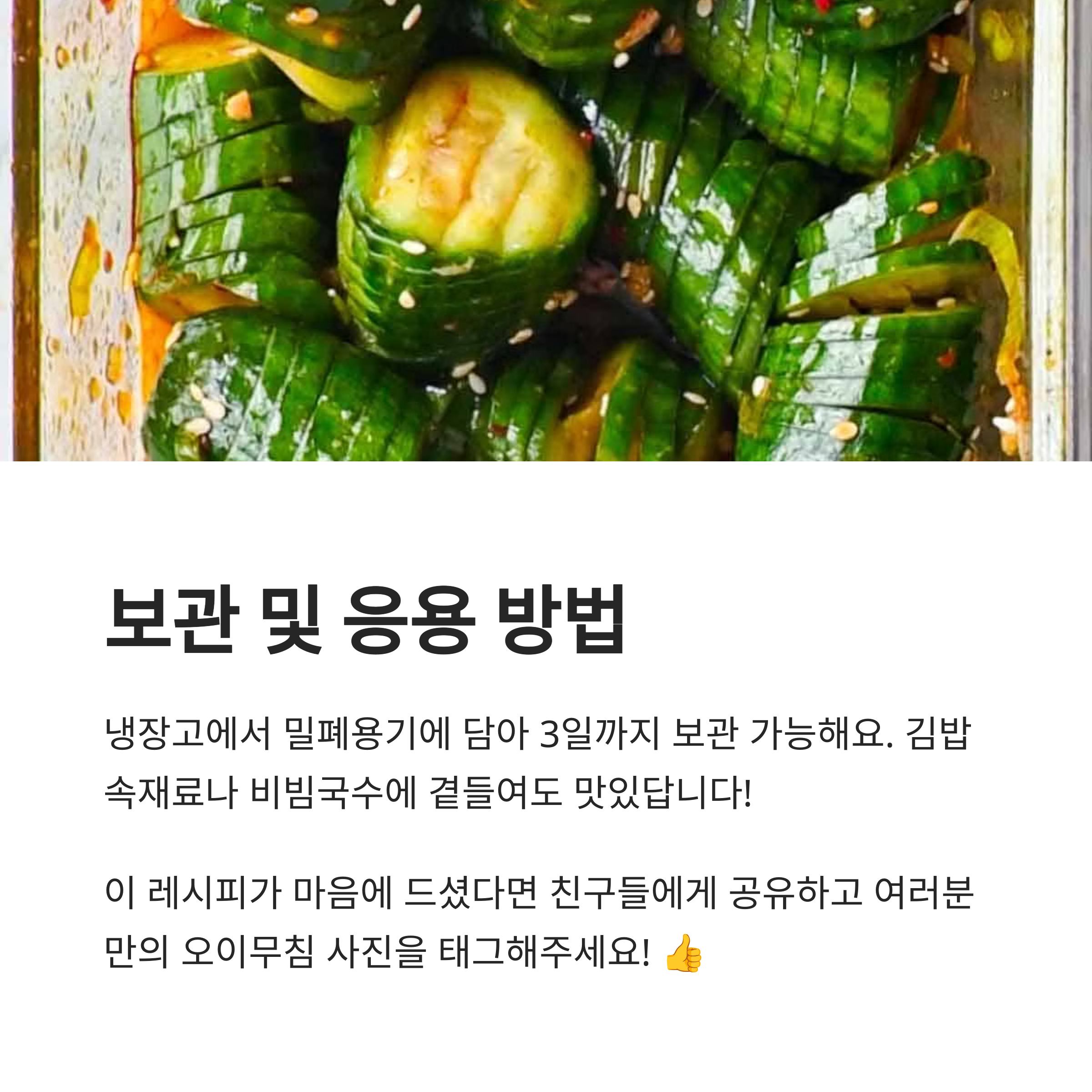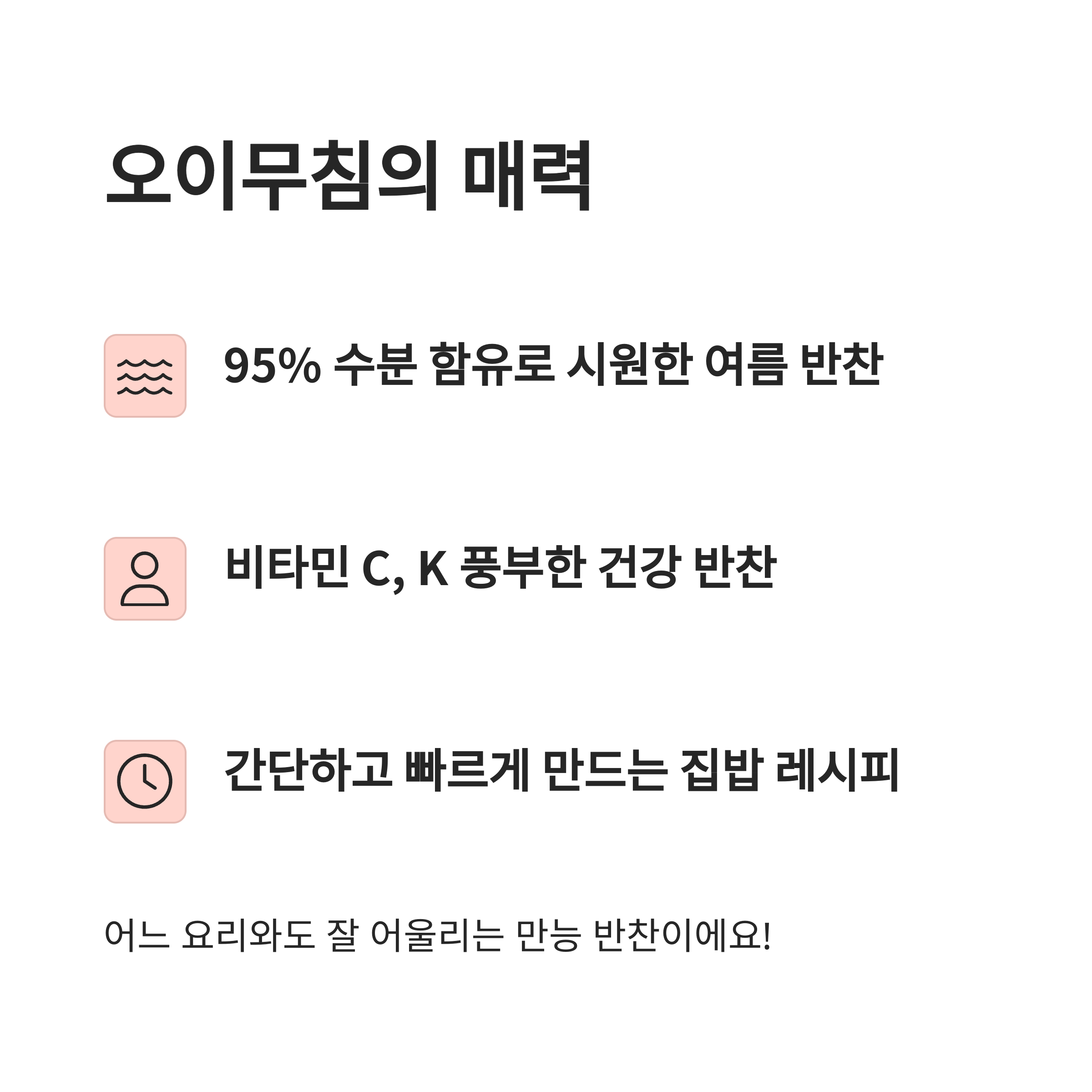 아삭한 오이와 새콤달콤한 양념의 조화는 집밥의 품격을 한층 높여주죠.