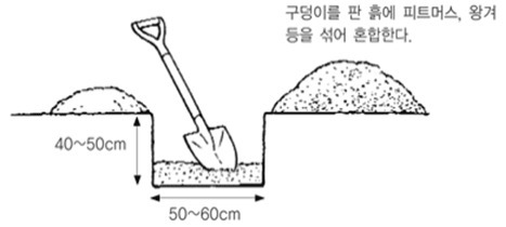 구덩이 준비재식 장소가 결정되었으면 가급적 구덩이를 미리 파서 완전히 발효된 유기 퇴비와 왕겨, 피트모스, 흙을 혼합하여 2-3개월 전에 미리 채워두면 좋다. 구덩이의 크기는 40~50cm 정도의 깊이에 폭은 50~60cm 정도면 적당하다. 단. 지나치게 점질 토양인 경우 다른 배수조치를 취하지 않으면 파둔 구덩이 속으로 물이 고여 뿌리가 상하기 쉬우므로 배수조치에 신경을 쓰도록 한다.