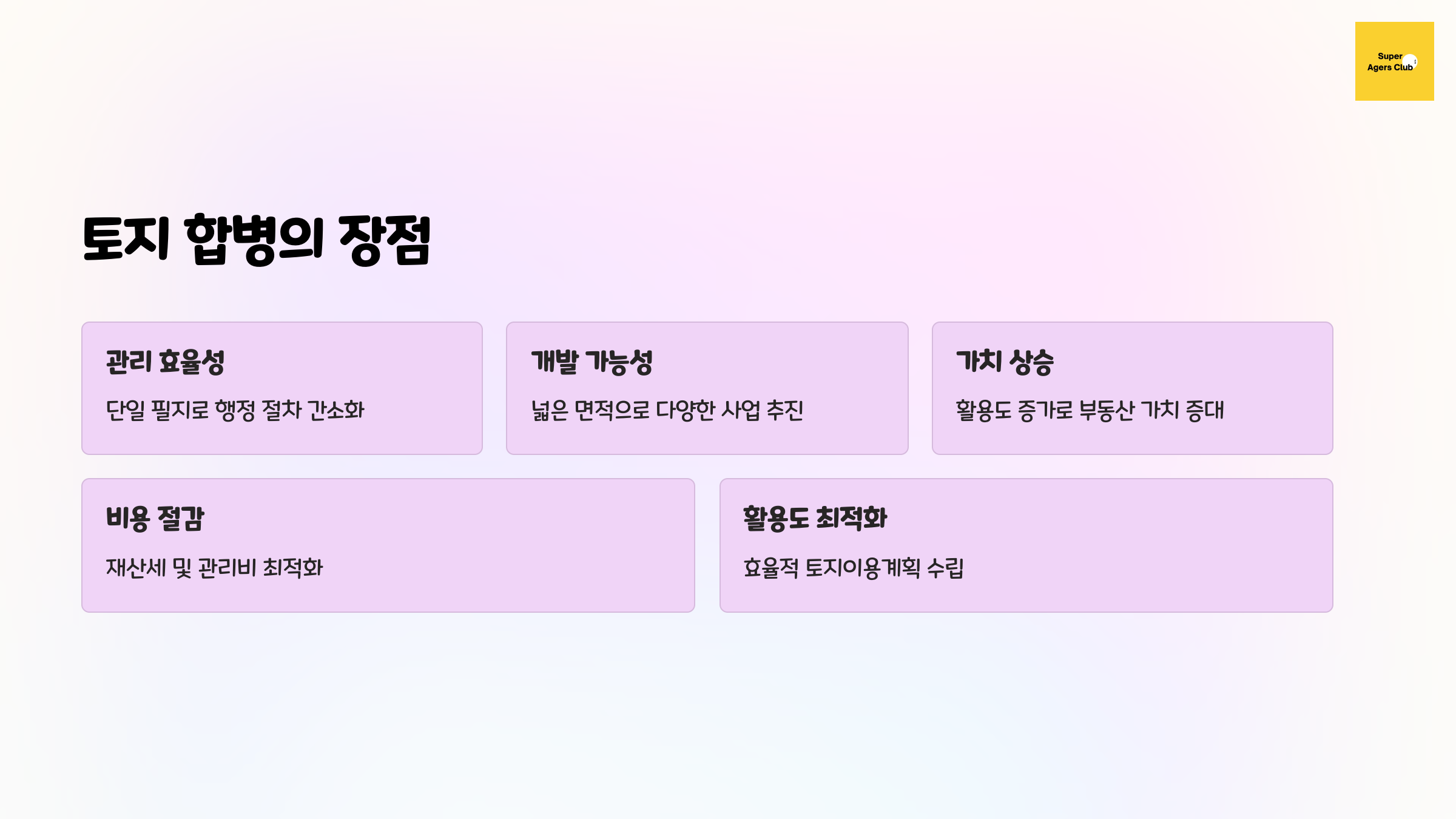 토지 합병은 작은 땅을 합쳐 개발하거나 재산 관리를 효율적으로 하고 싶을 때 유용하죠.
