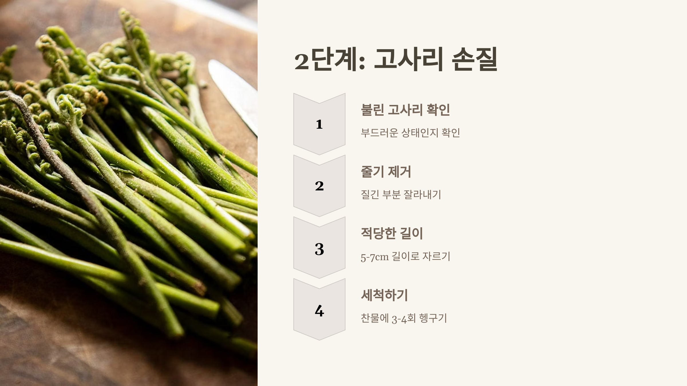 고사리나물 맛있게 하는 법은 손질에서 시작돼요. 건고사리는 물에 불리고, 생고사리는 뜨거운 물에 데쳐 독성을 제거해야 해요. 이 과정을 꼼꼼히 하면 쓴맛 없이 부드러운 식감을 얻을 수 있습니다.