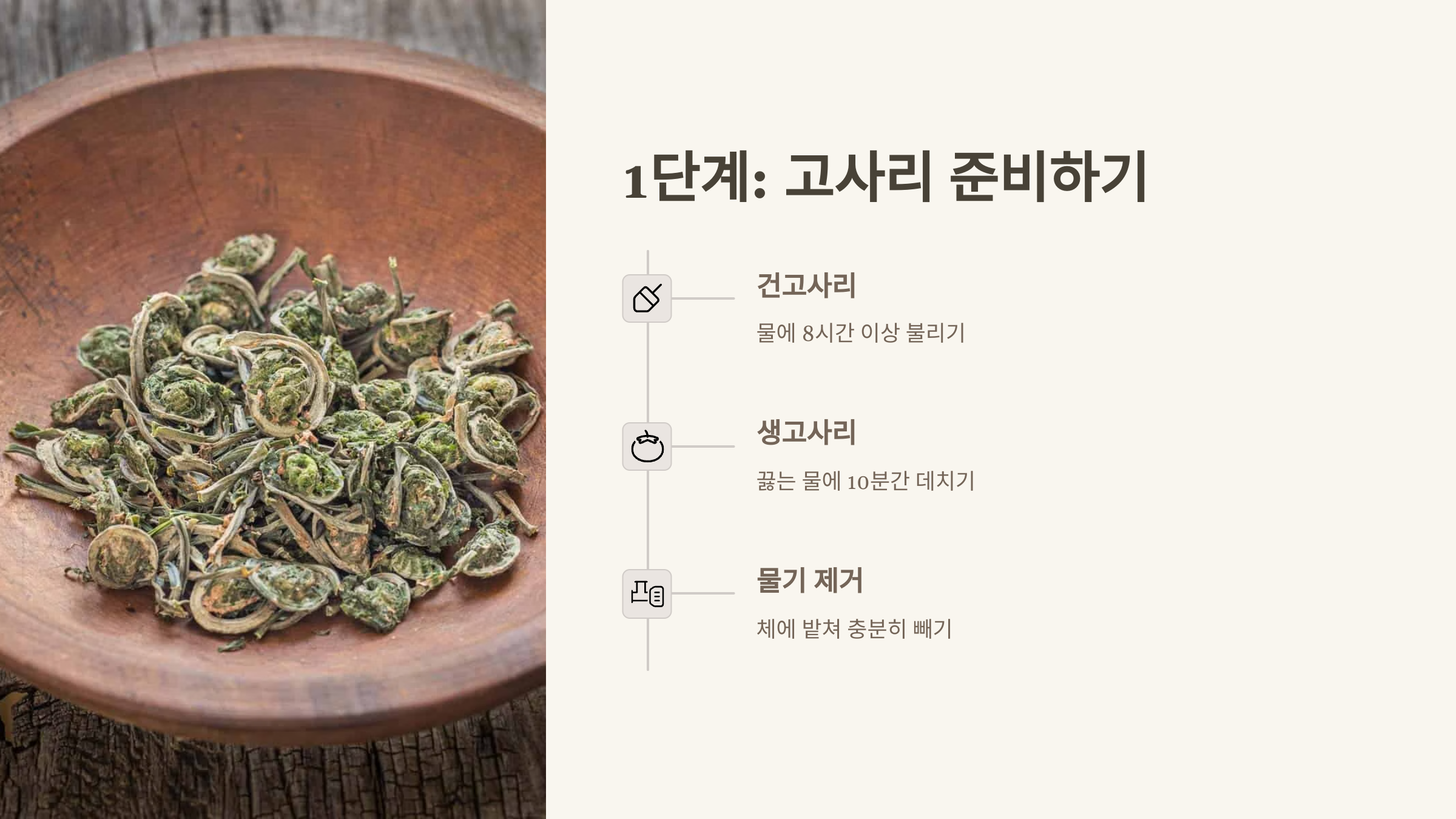 생고사리를 끓는 물에 소금(1t)을 넣고 3분 데친 뒤, 찬물에 2~3시간 담가두세요. 물을 한 번 갈아주면 쓴맛이 확 줄어듭니다. 농촌진흥청에서도 이 방법을 권장해요. [농촌진흥청]