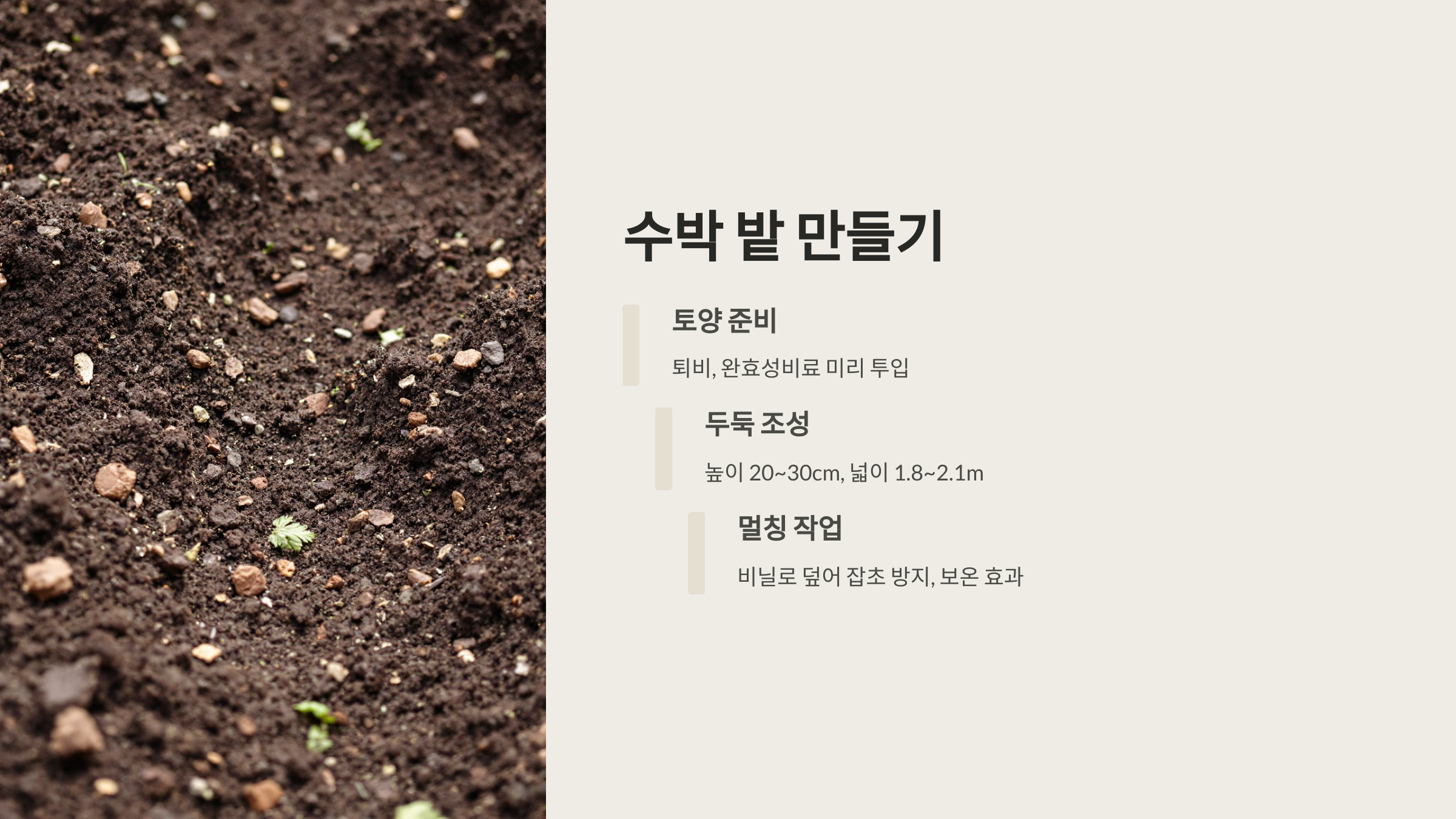 두둑은 너비 2~3m, 높이 20cm로 만들고, 흑색 비닐 멀칭을 하면 지온 상승과 잡초 억제 효과를 볼 수 있습니다. 멀칭은 수박 모종 심는 시기 직전에 완료하세요.