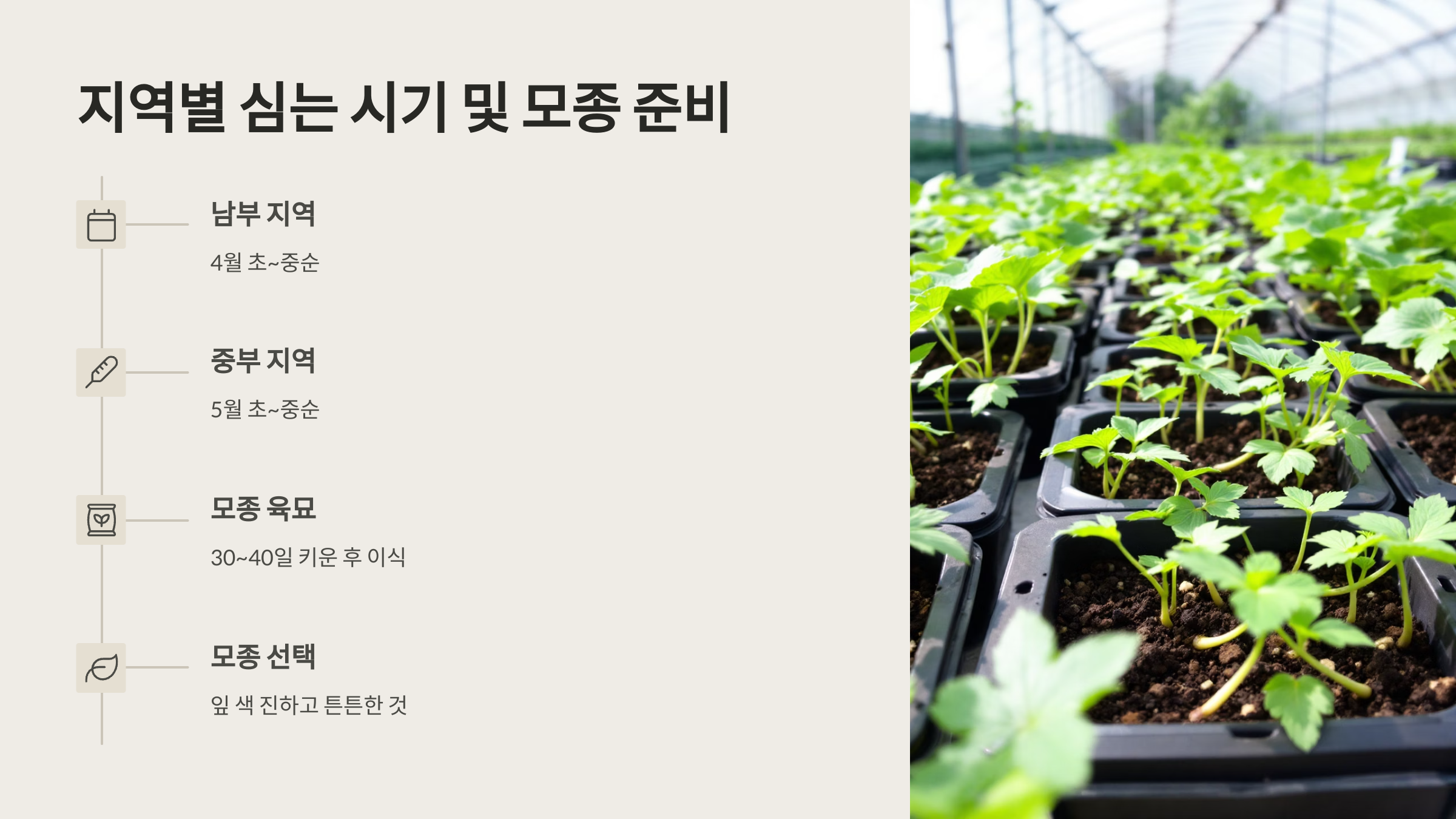 1. 모종 선택: 본잎 3~5장, 잎 색이 진한 녹색인 건강한 모종을 선택하세요.