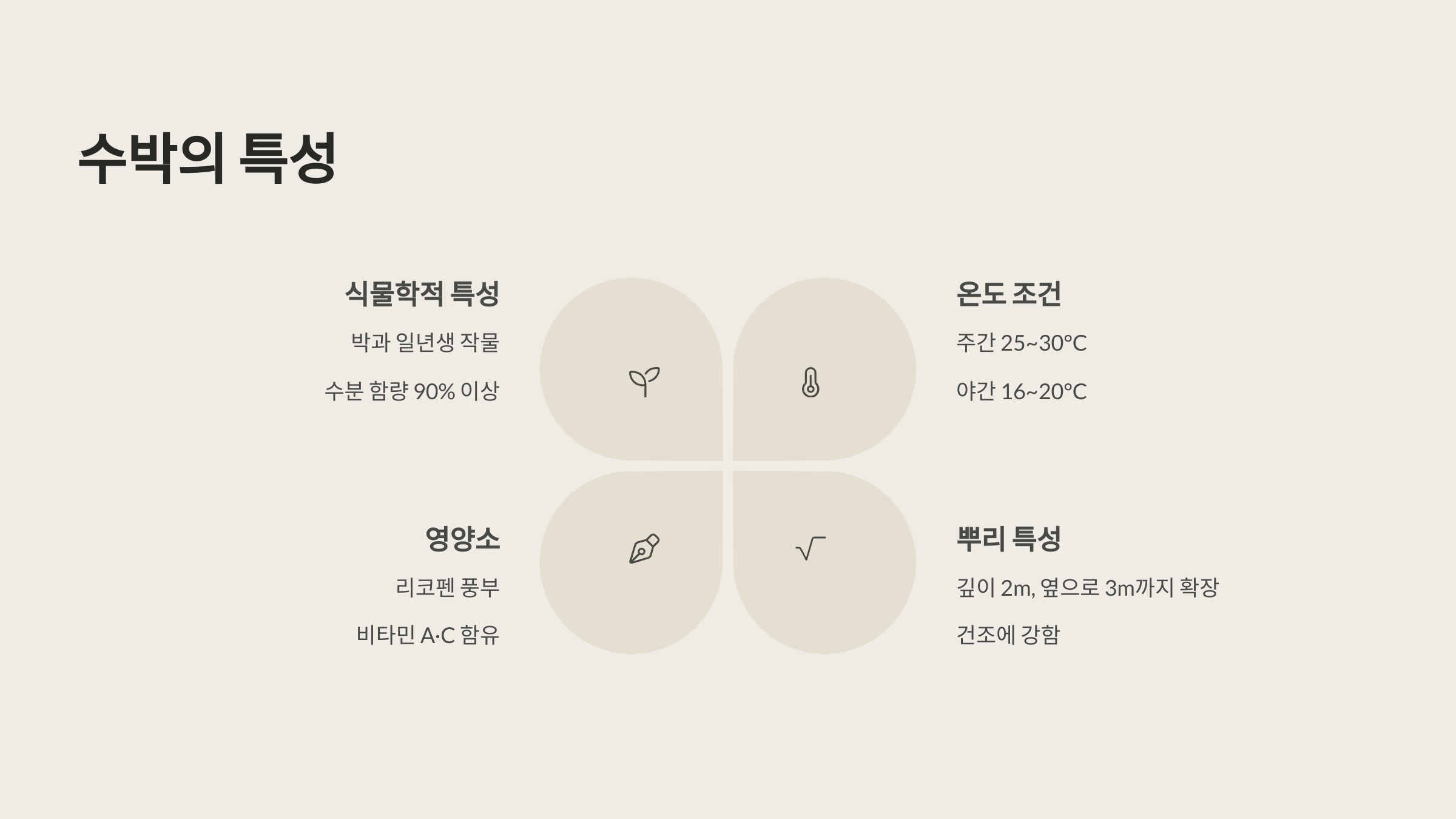 뿌리는 깊이 2m, 옆으로 3m까지 뻗으며, 건조에는 강하지만 습해에는 약한 특성을 가집니다. 이러한 특성을 이해하면 수박 재배하는 방법을 계획하는 데 큰 도움이 됩니다.