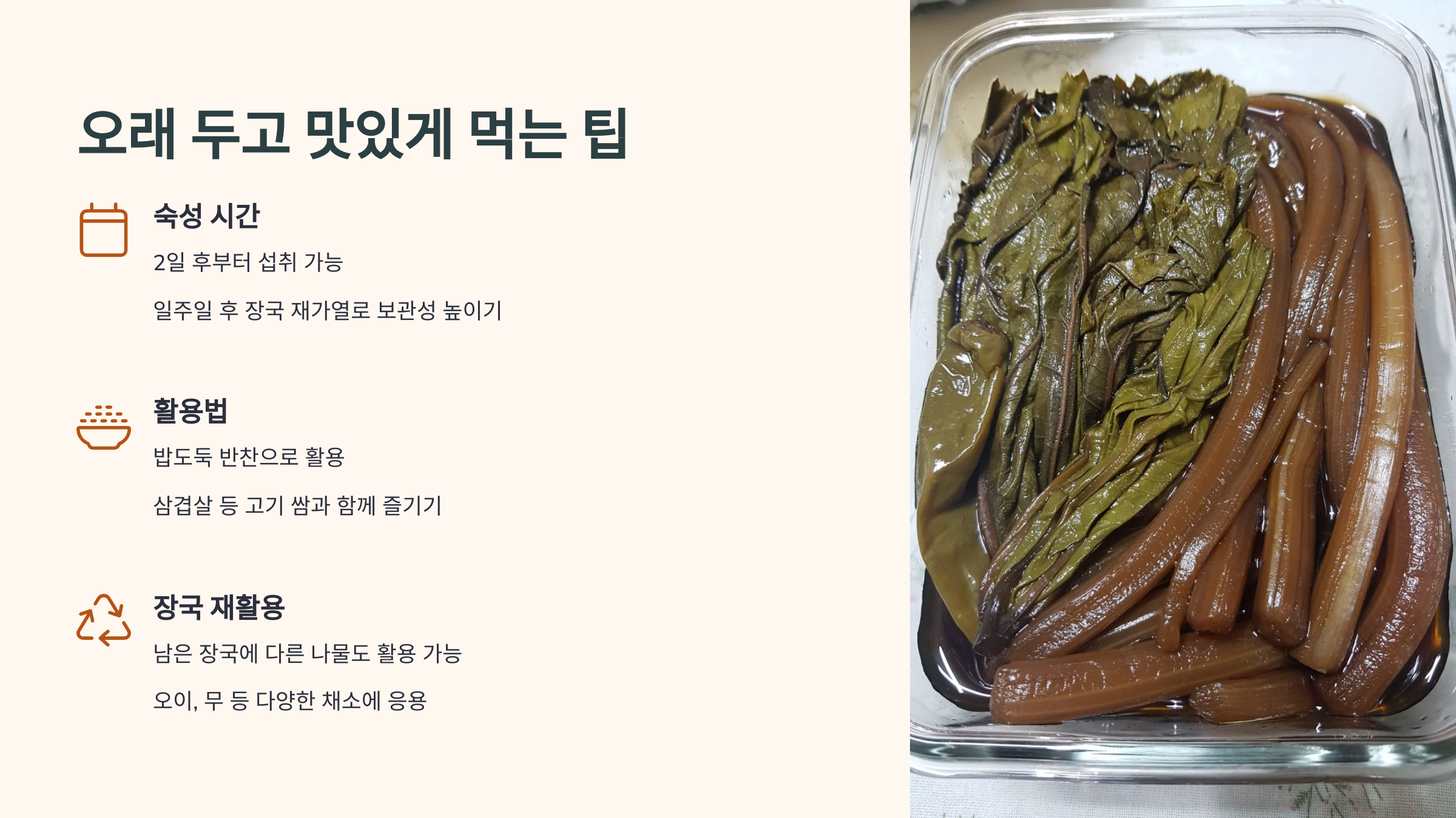 실온에서 하룻밤 두었다가 냉장고로 옮겨 3~5일 숙성하면 먹기 좋아요. 이 과정이 머위장아찌 담는법의 완성도를 높입니다.