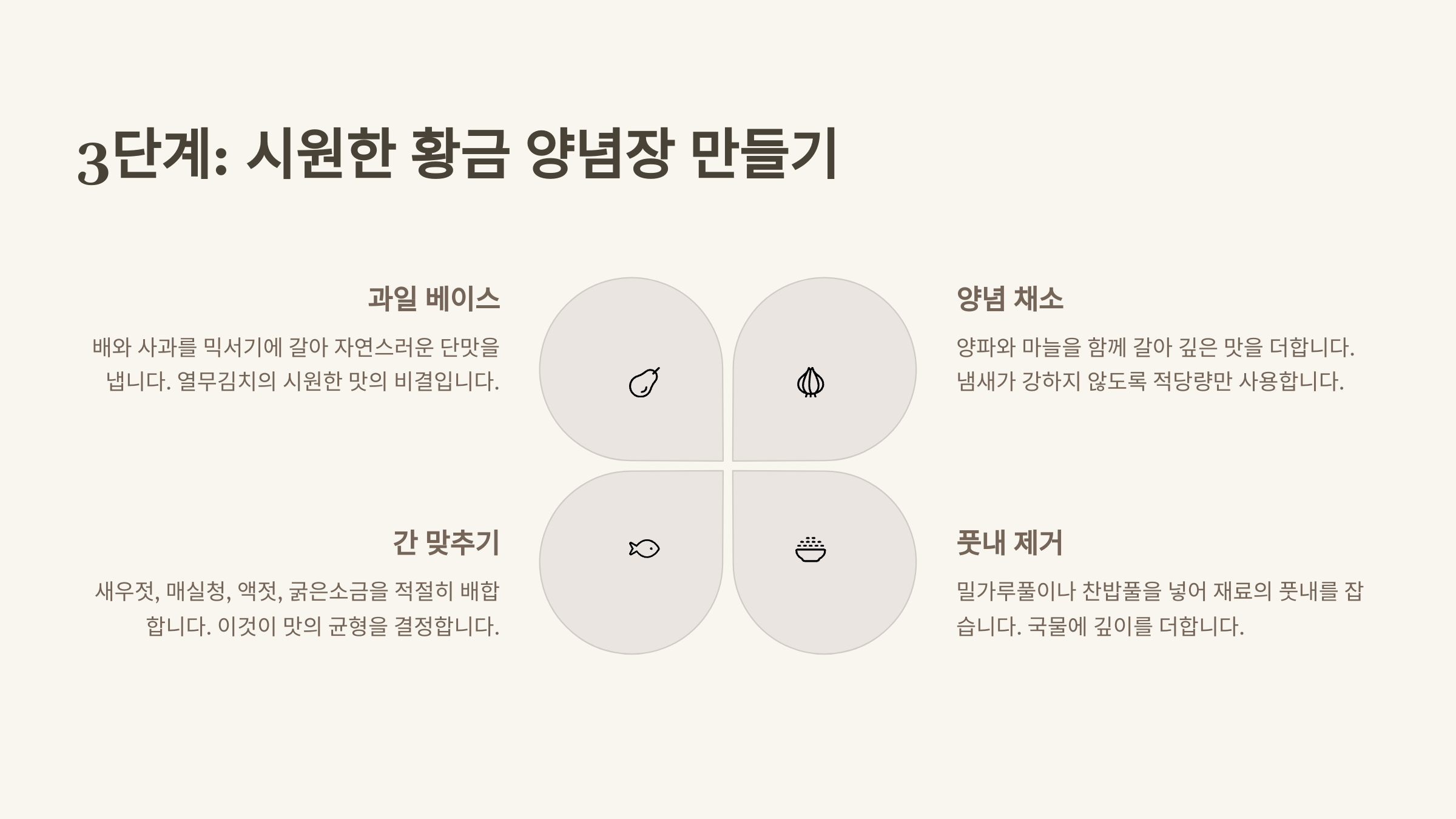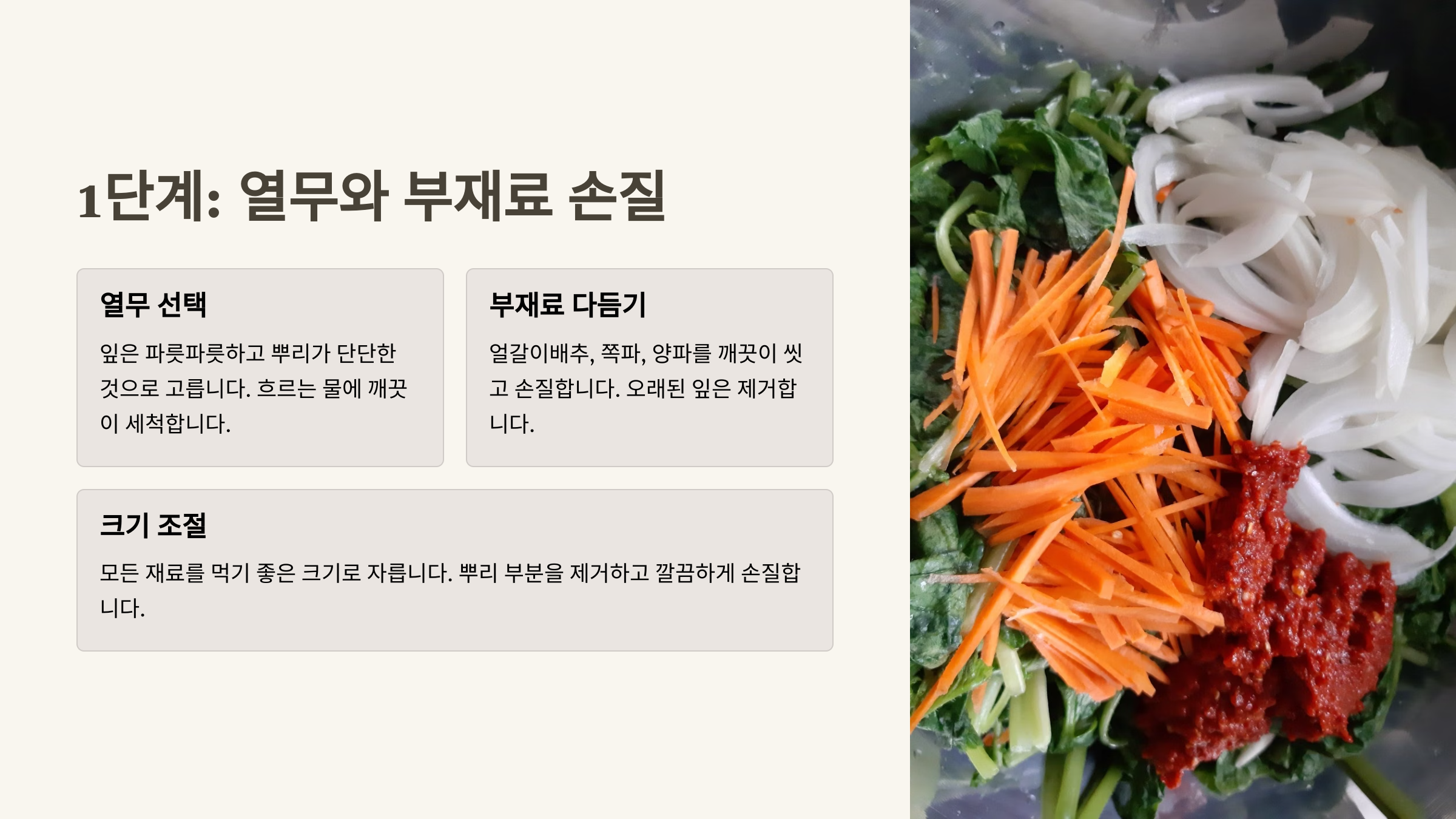 재료 신선도: 열무는 잎이 파릇하고 뿌리가 단단한 것을 선택하세요. 오래된 열무는 쓴맛이 강할 수 있습니다.