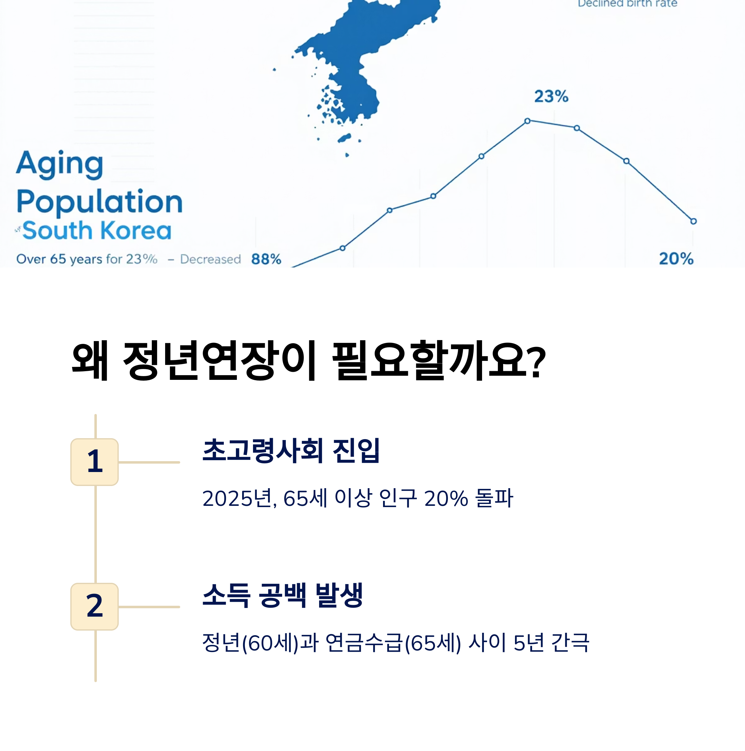 한국은 2025년 초고령 사회로 접어들며 정년연장 65세 시행 시기에 대한 논의가 뜨겁습니다.