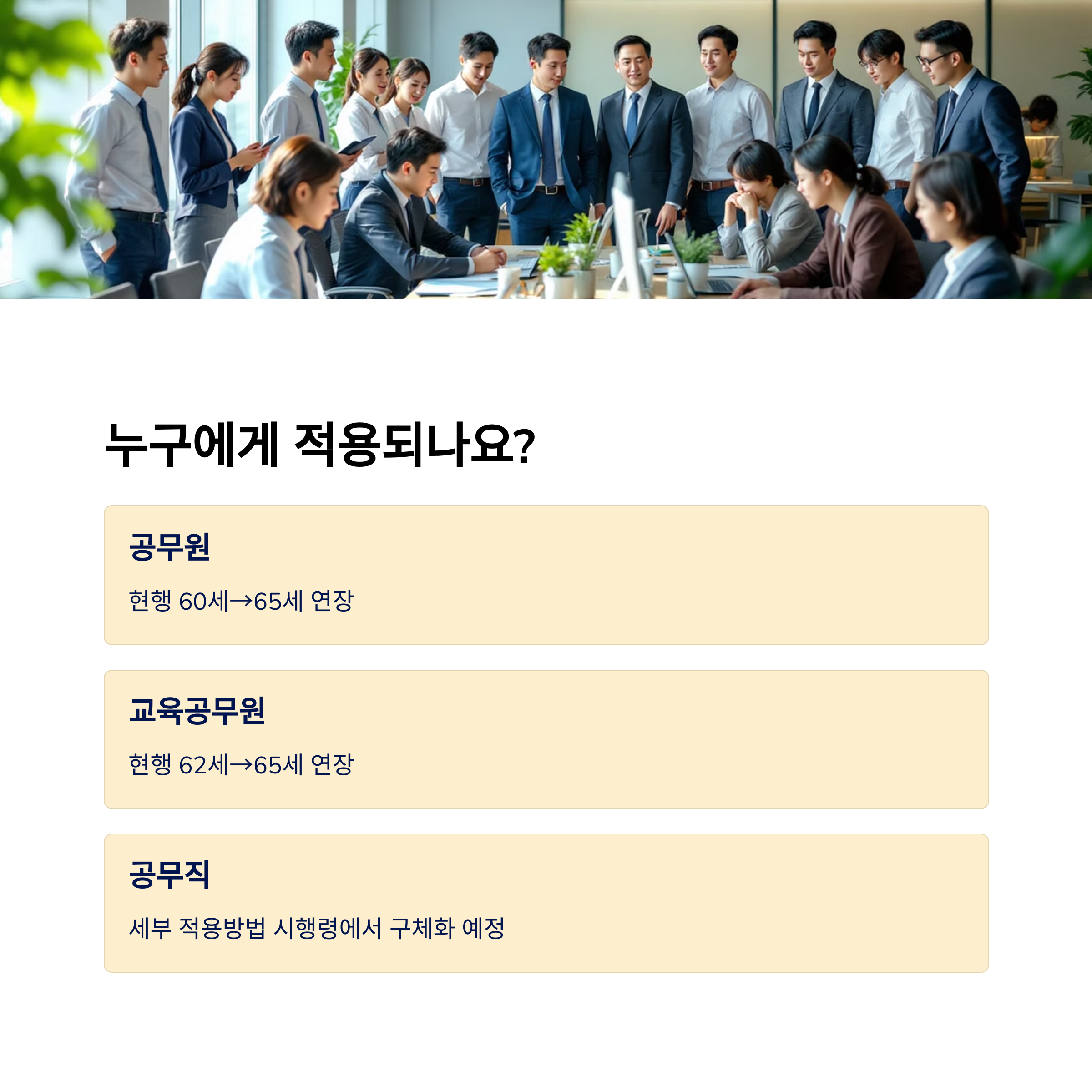 입법안과 정부 논의를 종합하면, 정년연장 65세 시행 시기는 2027년부터 시작되어 2033~2034년 전면 도입될 가능성이 큽니다. 공무원과 교사는 국가공무원법, 교육공무원법 개정을 통해 적용되며, 공무직은 이미 일부 선행 사례가 있습니다.