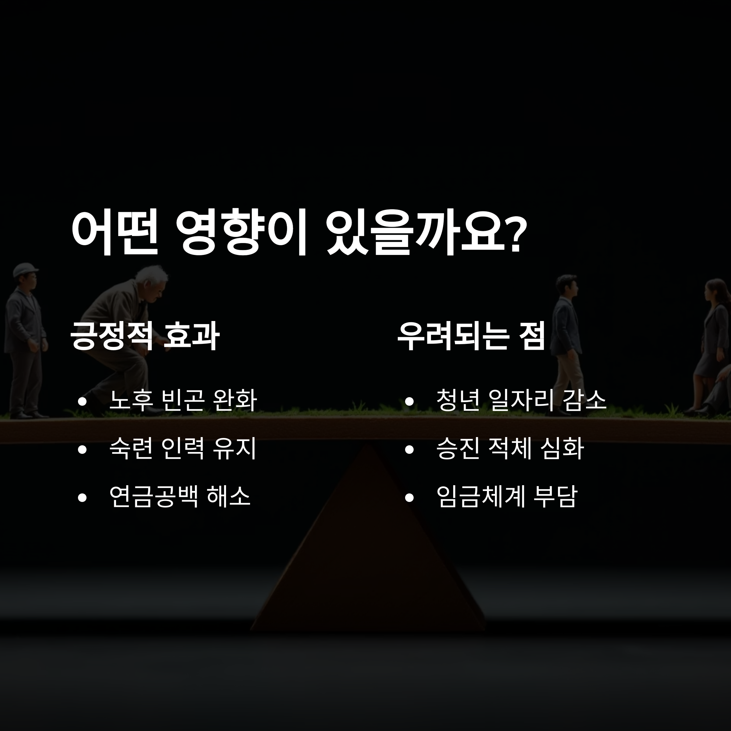 반대: 청년 취업 기회 감소, 조직 혁신성 저하, 임금 체계 부담.
