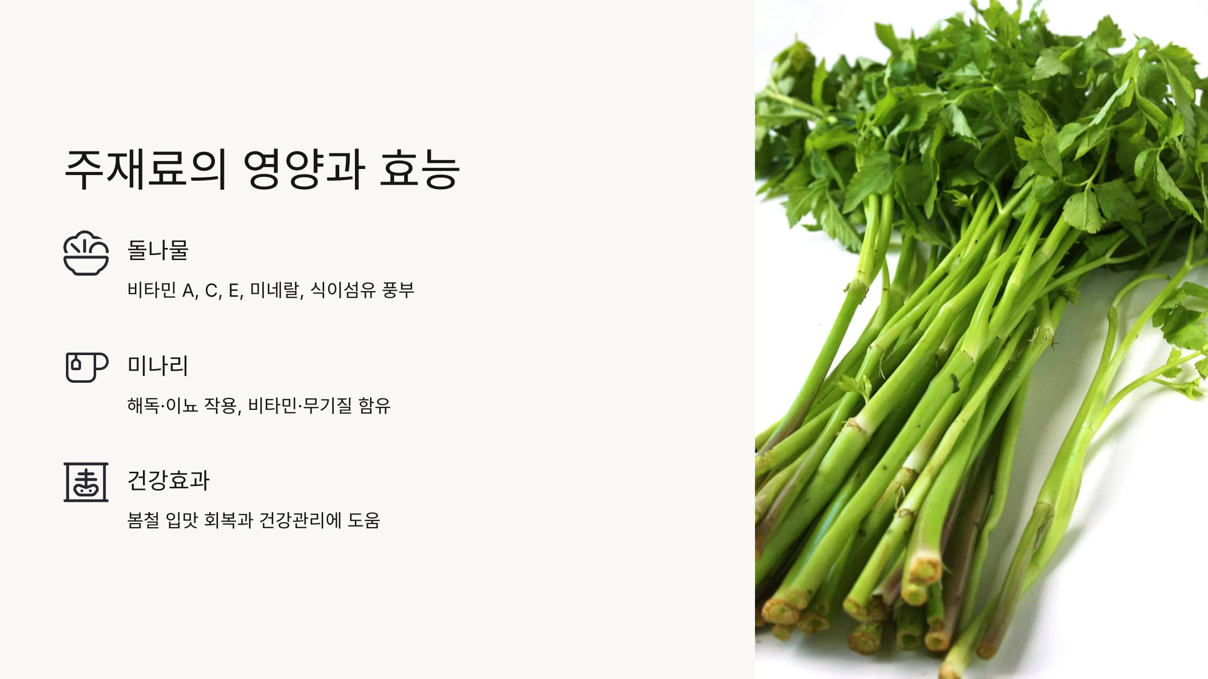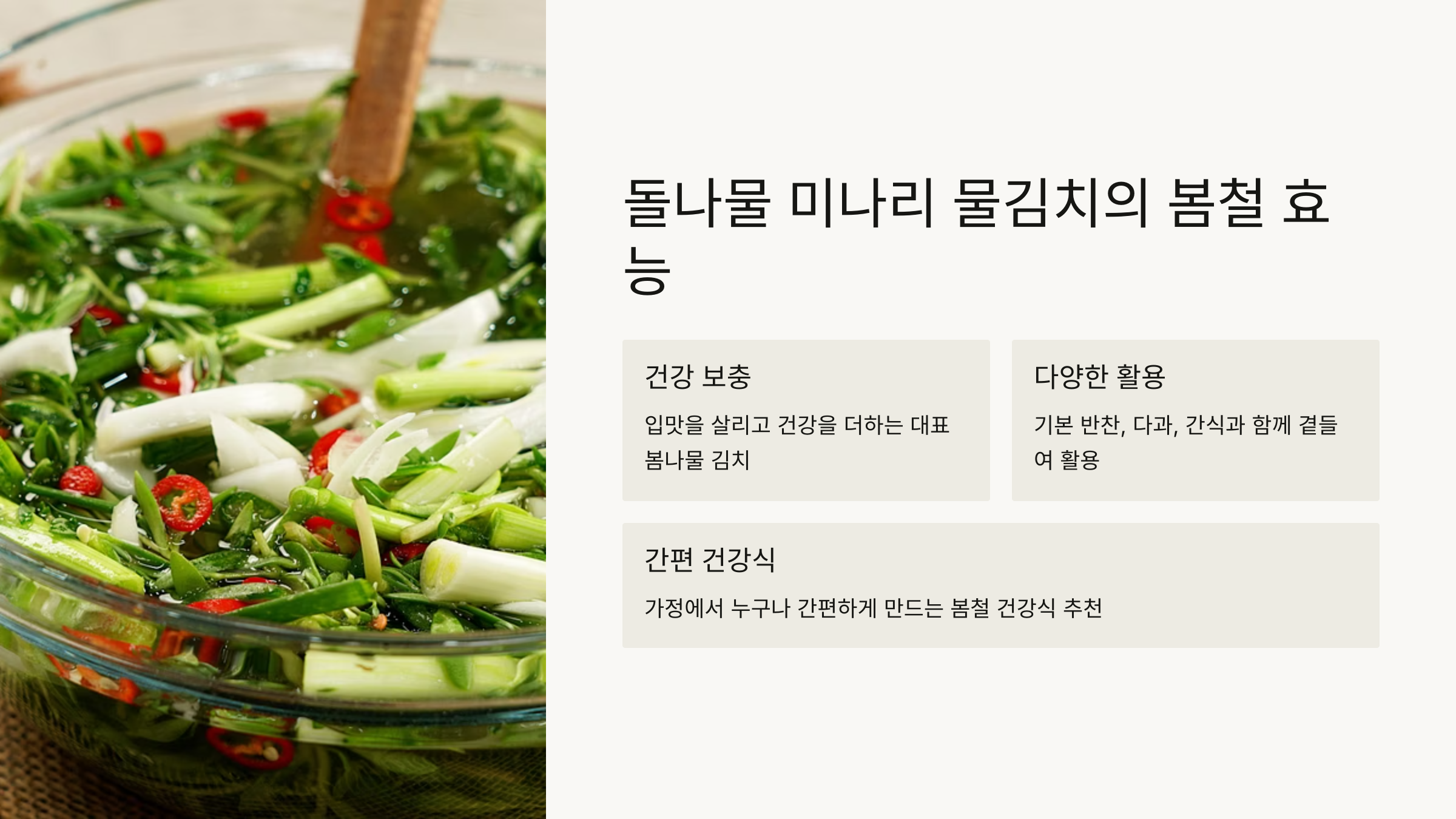 봄이 되면 가장 기다려지는 것 중 하나가 바로 제철 나물로 만든 신선한 요리입니다. 그중에서도 돌나물과 미나리를 활용한 물김치는 아삭한 식감과 상큼한 맛으로 입맛을 사로잡는 건강식이죠.